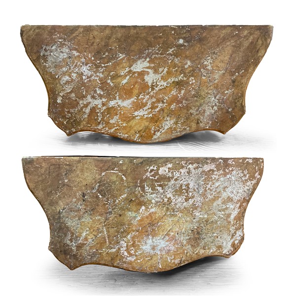 Coppia di mensole in legno intagliato e dorato, piano a finto marmo di forma sa