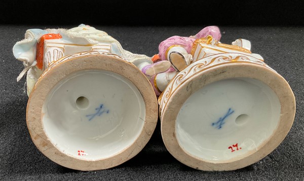 Manifattura di Meissen, secolo XIX. Coppia di fanciulli seduti in porcellana dipinta in policromia con profili in oro (h. max cm 14) (restauri)
