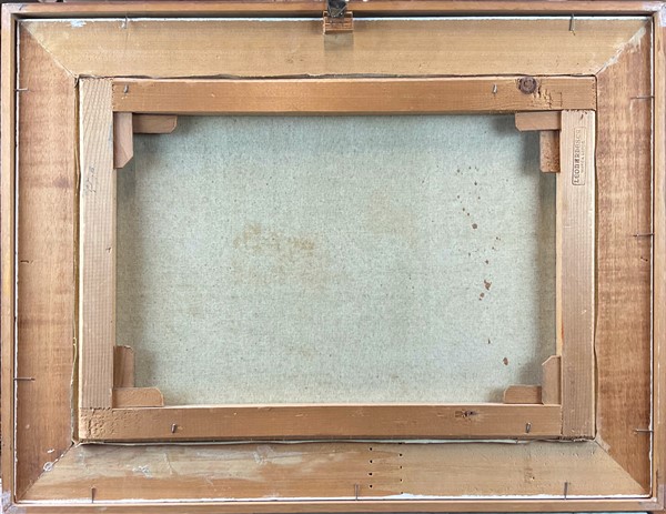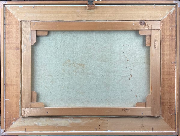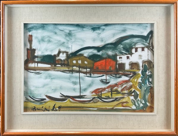 Firma indecifrata "Paesaggio con barche" 1969, olio su tela (cm 35x50) firmato