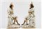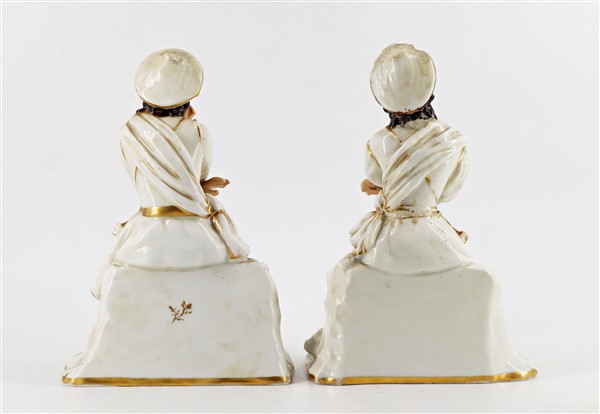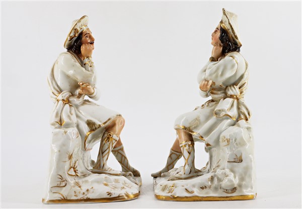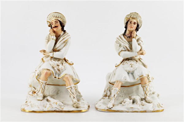 Manifattura del secolo XIX. Coppia di figure in porcellana in parte policroma con profili in oro (h max cm 21,5) (difetti e restauri)