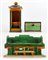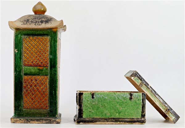 Gruppo di oggetti funerari composto da un baule, un paranchino e un tavolo da altare in terracotta invetriata nei colori Sancai