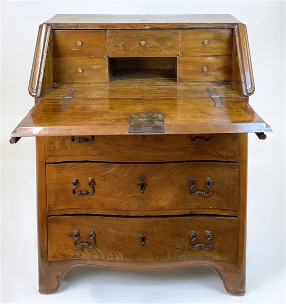 Ribalta in noce con fronte mosso a tre cassetti e calatoia che rivela cinque tiretti ed un vano. Piemonte, secolo XVIII (cm 97x110x51) (difetti, mancanze e restauri)