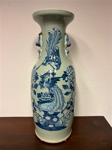 Vaso a balaustro con doppie anse leonine in porcellana color celadon decorato con motivi floreali e fenice nei toni del blu