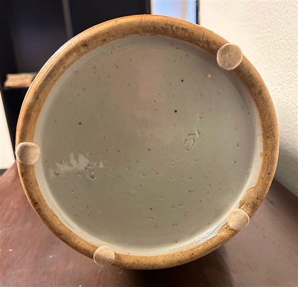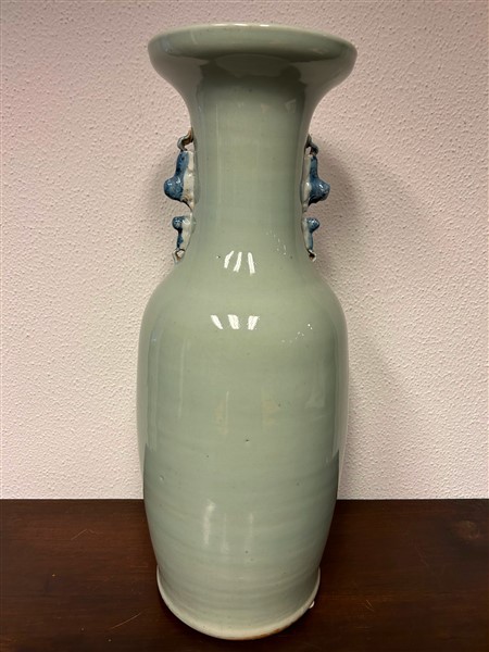Vaso a balaustro con doppie anse leonine in porcellana color celadon decorato c