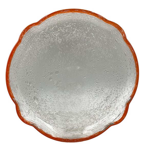 Centrotavola a bordo mistilineo in vetro soffiato incolore con inclusione di bolle e bordo applicato in pasta vitrea arancio. Nancy, seconda metà secolo XX. Firmato a punta. (d cm 32) (lievi difetti)