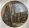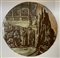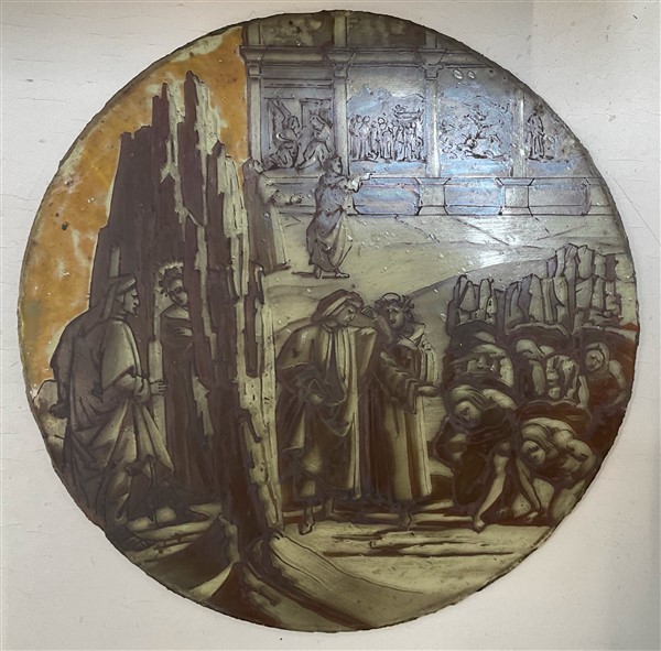 Lotto 1982 | Pannello in vetro circolare retrodipinto con scene dantesche in monocromo, seco