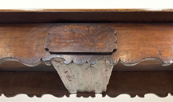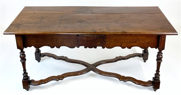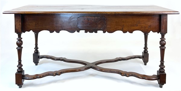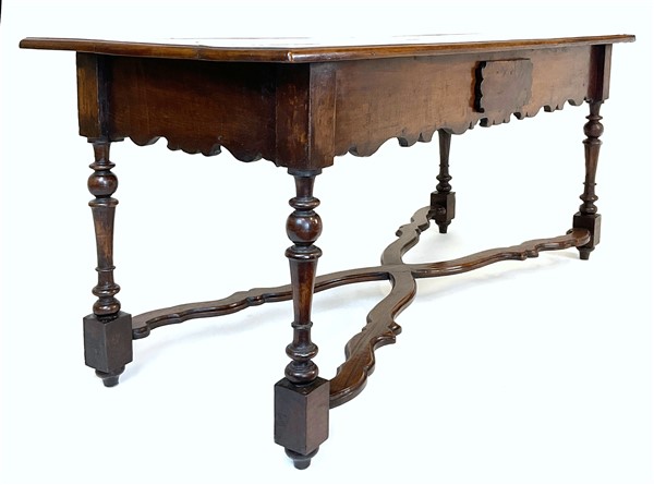 Tavolo in noce con gambe tornite a rocchetto raccordate da traverse mistilinee incrociate, grembiale sagomato e cassetto nella fascia. Secolo XVIII (cm 171x79x71) (difetti e restauri)