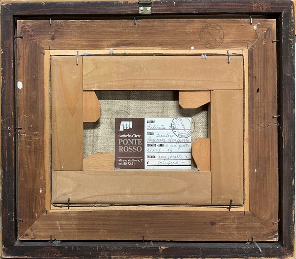 "Le amiche e il gattino" tempera e acquerello su carta intelata (cm 18x24) firmato in basso a destra; etichetta al retro della Galleria d'Arte Ponte Rosso, Milano