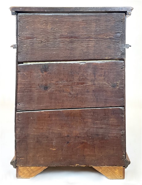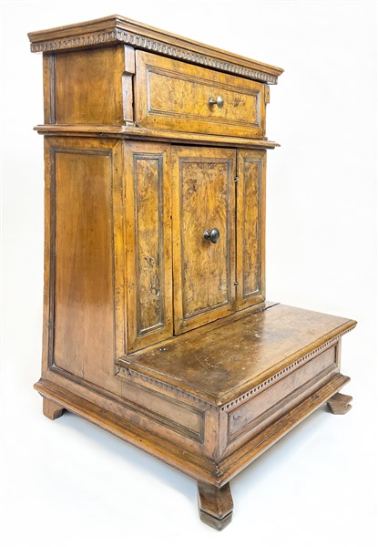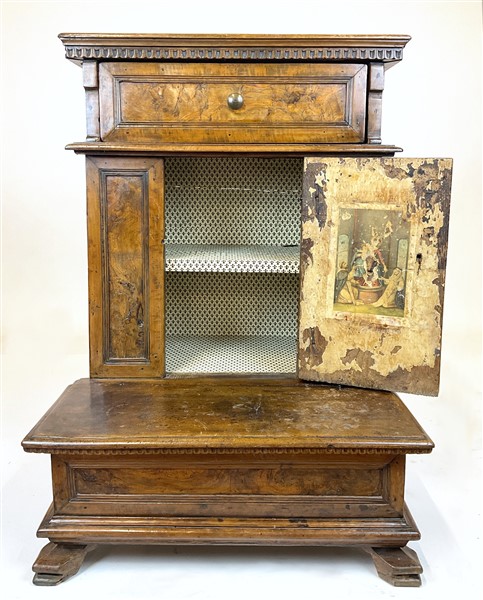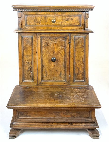 Antico inginocchiatoio in noce e radica di noce ad un'anta ed un cassetto nella fascia dentellata, base con pianetto apribile (cm 65,5x95x59) (restauri e sostituzioni)