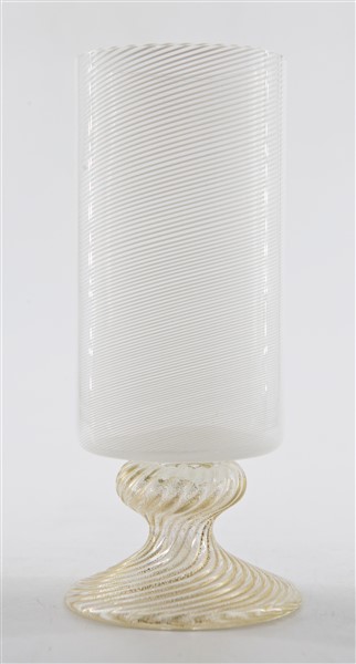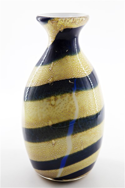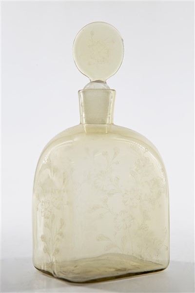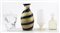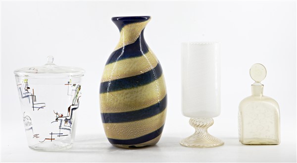 Compostiera in vetro cristallo decorato a smalto con motivi novecenteschi attribuibile alla manifattura Salir. Unito a un portaprofumo, un bicchiere e un vaso in vetro soffiato di decori diversi. Secolo XX. (h max cm 22) (lievi difetti)