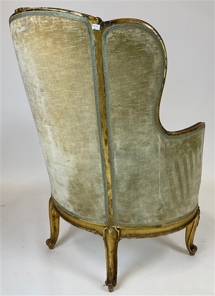 Bergère di forma mossa in legno intagliato e dorato con schienale centrato da v