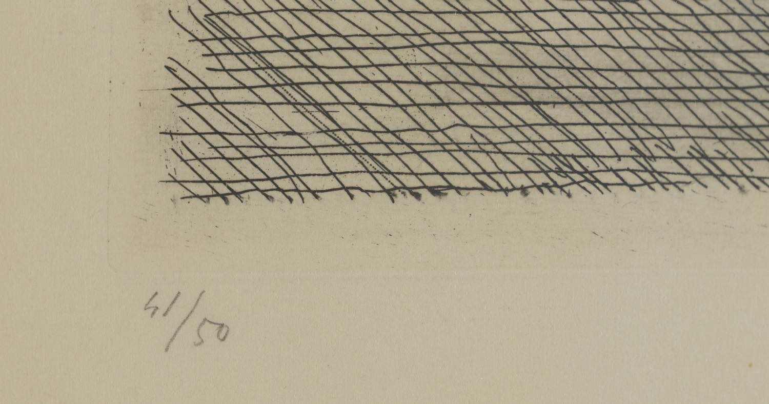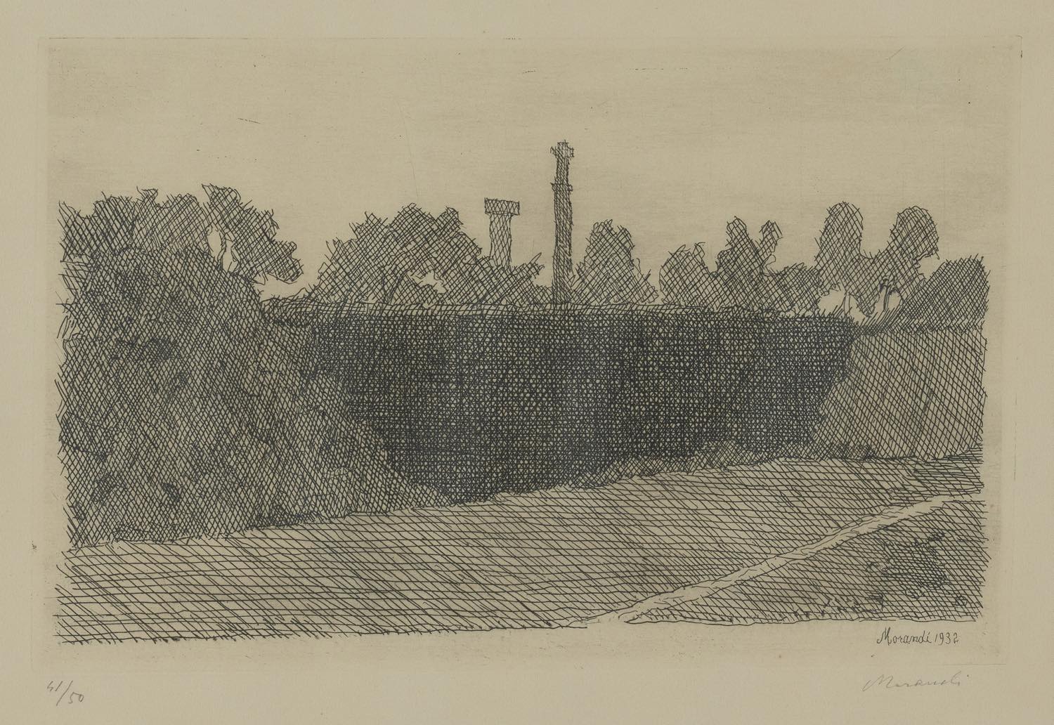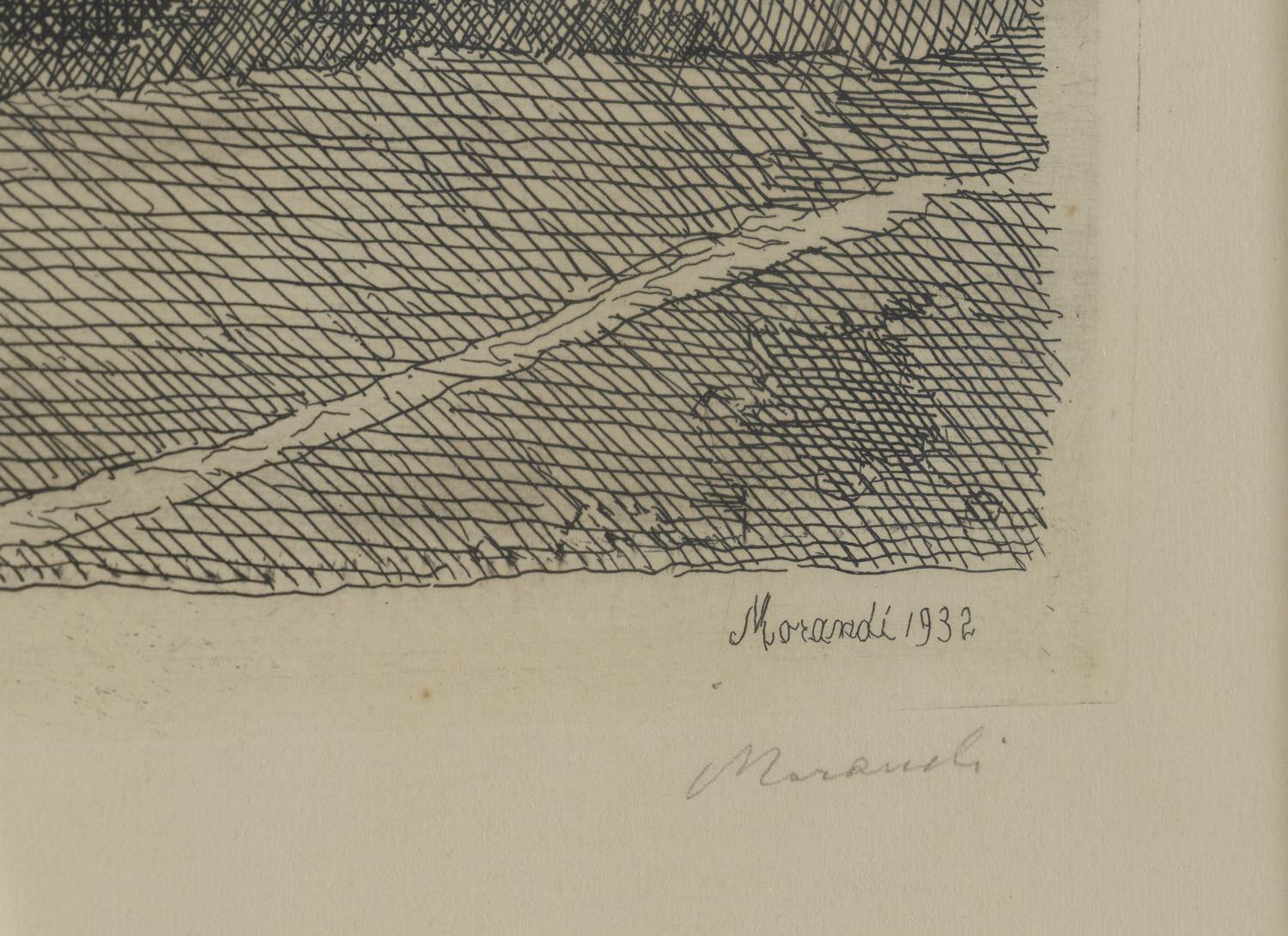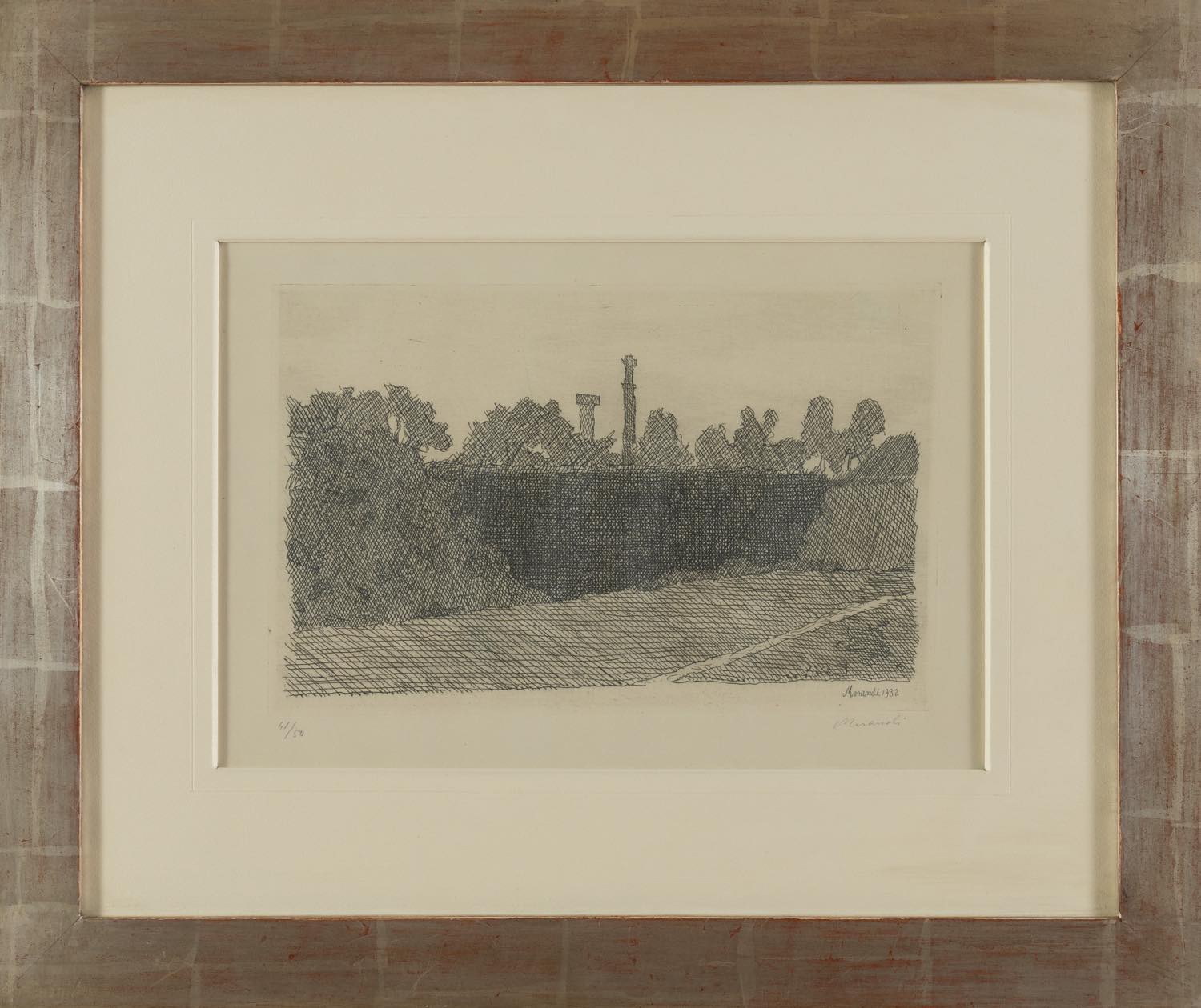 Giorgio Morandi (Bologna 1890 -1964), “Veduta della Montagnola di Bologna”, 1932.Acquaforte su carta I stato, firmata in basso a destra, numero di tiratura in basso a sinistra 41/50, reca sulla lastra in basso a destra firma e data, presenta al retro etichetta della Galleria La Loggia - Bologna con autore, titolo, tecnica, anno e pubblicazione e timbro della collezione, H cm 20.8x33.2 in alto/32.8 in basso - Notes: Provenienza: Collezione Privata Zaccardi – Bologna; Galleria La Loggia – Bologna.
