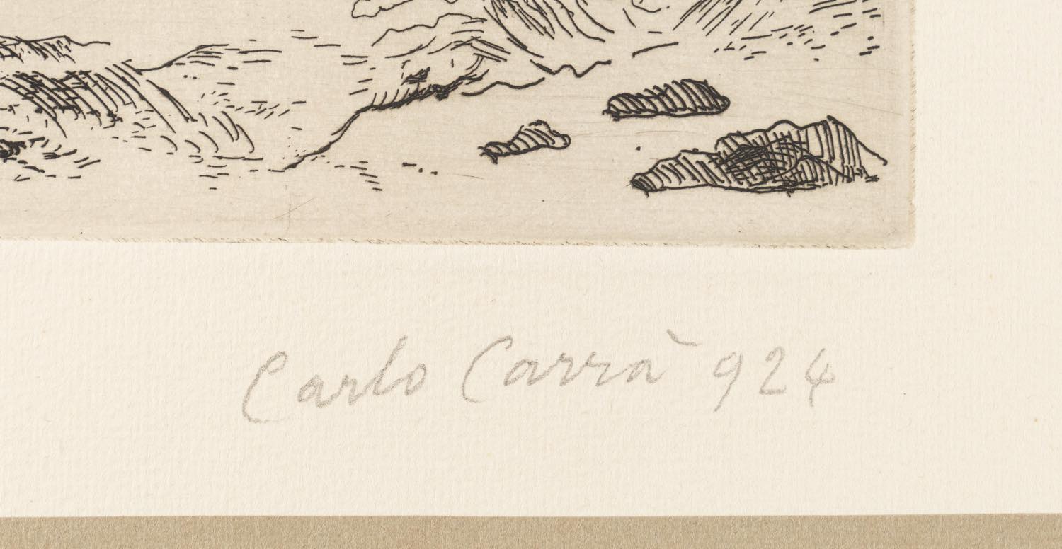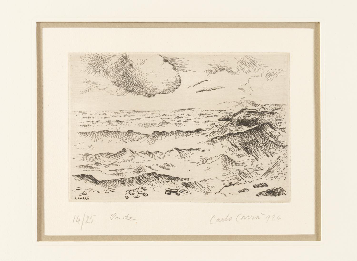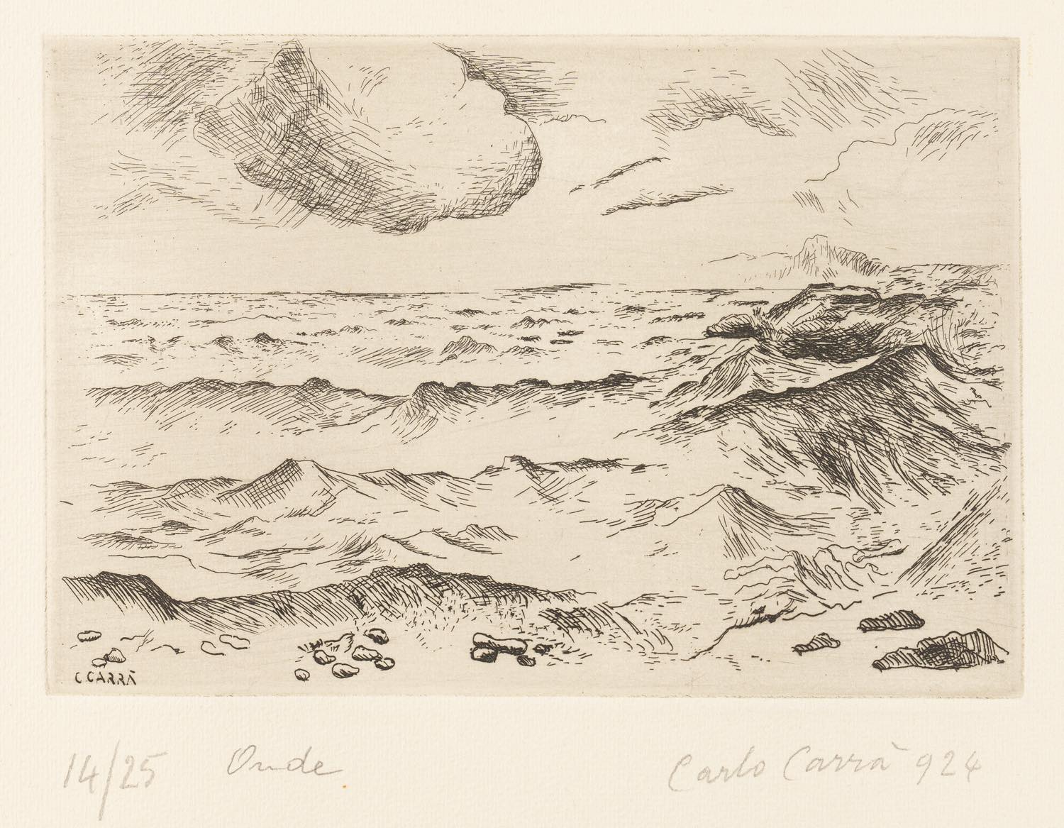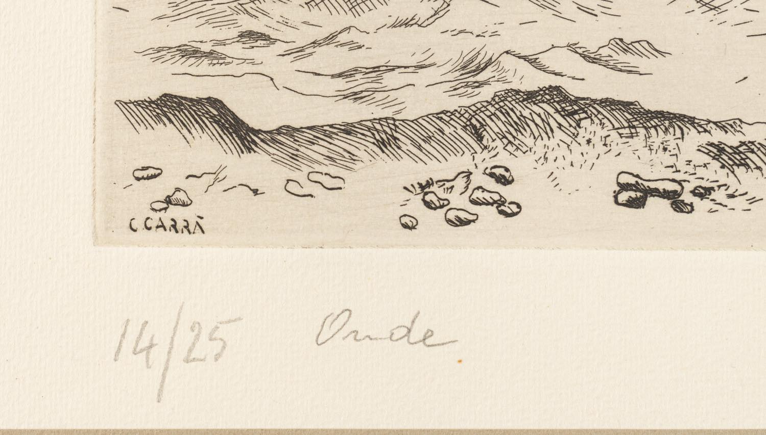 Carlo Carrà (Quargnento 1881 - Milano 1966), “Onde”, 1924.Acquaforte su carta, firmata e datata in matita in basso a destra, reca in basso a sinistra numero di tiratura 14/25 e titolo, presenta in basso a destra sulla lastra firma dell’artista, H cm 14.8x21.8 - Notes: Provenienza: Collezione Privata Zaccardi – Bologna.Opera pubblicata in “Carlo Carrà. Opera grafica 1922 – 1964” a cura di Massimo Carrà, Vicenza, Neri Pozza Editore, 1976, img. 18, descrizione a p. 37; “Omaggio a Carlo Carrà. Tutta l’opera grafica 111 fogli eseguiti dal 1922 al 1964”, Sasso Marconi, La Casa dell’Arte Editrice, 1985, p. 10.