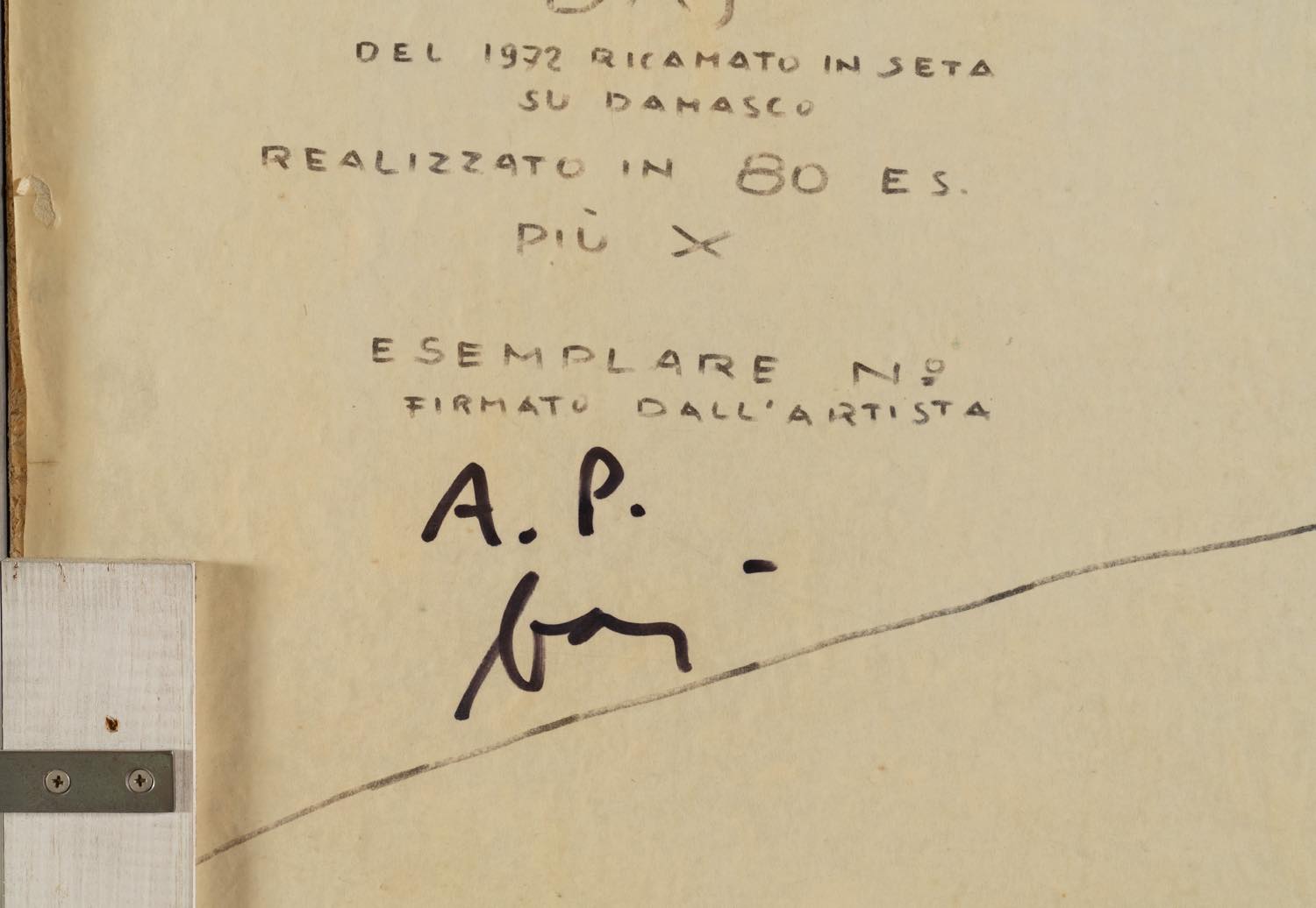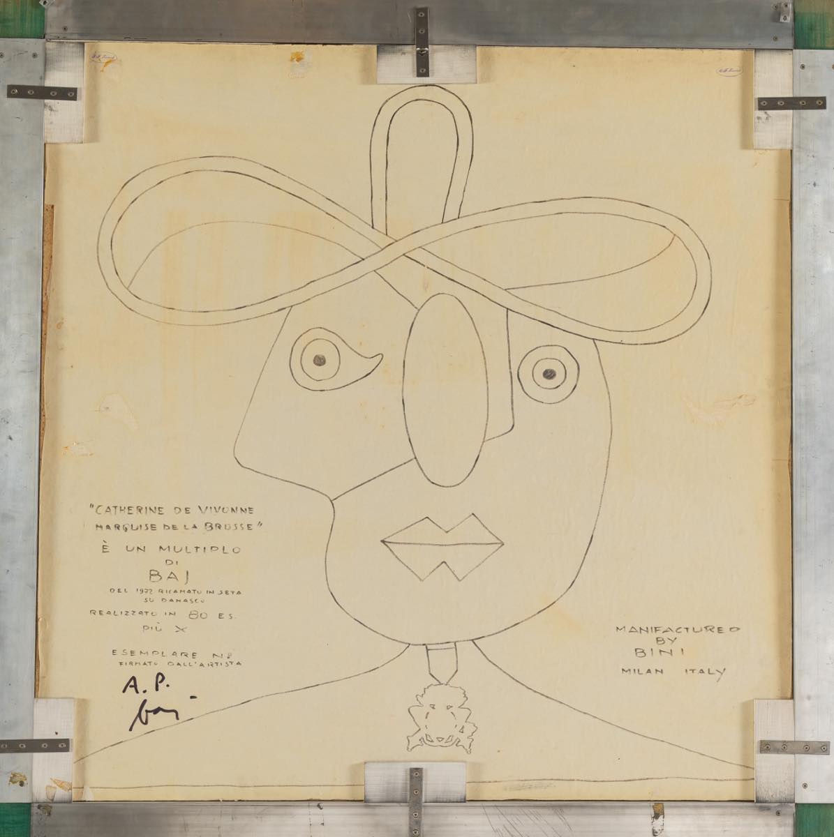 Enrico Baj (Milano 1924 - Vergiate 2003), “Catherine de Vivonne Marquise de la Brosse”, 1972.Assemblage ricamato in seta su damasco applicato su tavola, reca al retro iscrizione con titolo, tecnica e tiratura, esemplare A.P. e firma dell’artista, Manifactured by Bini - Milano e timbro della collezione, H cm 85x85 (entro cornice originale dell’artista) - Notes: Provenienza: Collezione Privata Zaccardi – Bologna.Opera pubblicata in J. Petit "Enrico Baj. Catalogue de l'Oeuvre Graphique et des Multiples. Volume II 1970-1973" Geneva, Editions Rousseau, 1973, p.94, p. 104 n. 38 ill.