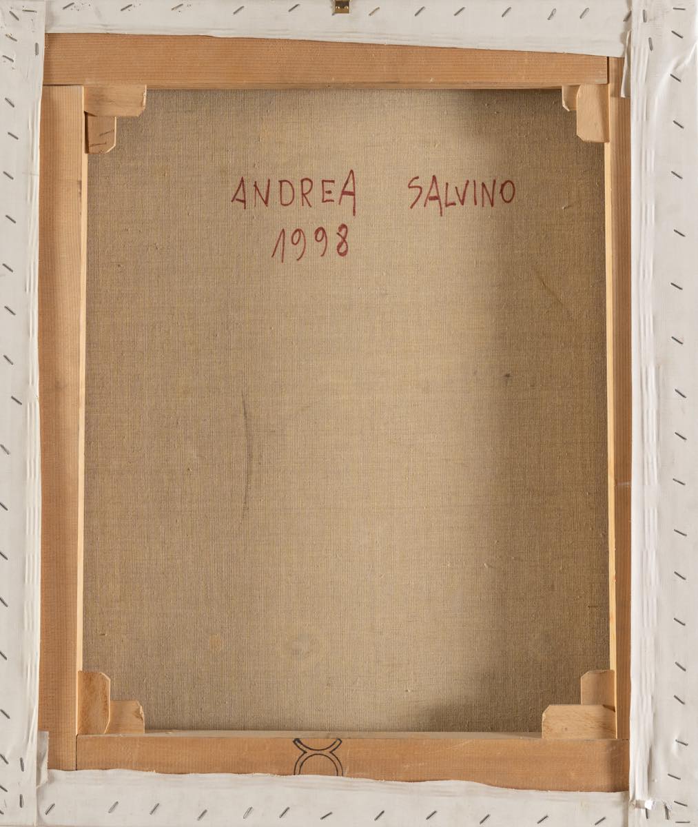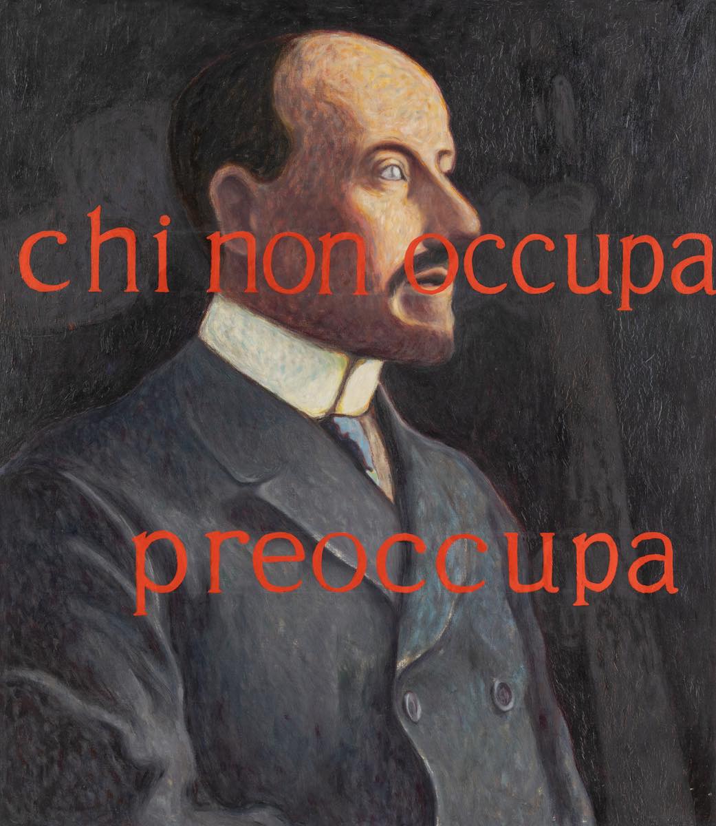 Andrea Salvino (Roma 1969), “Chi non occupa preoccupa”, 1998.Olio su tela, reca al retro firma e data, H cm 70x60