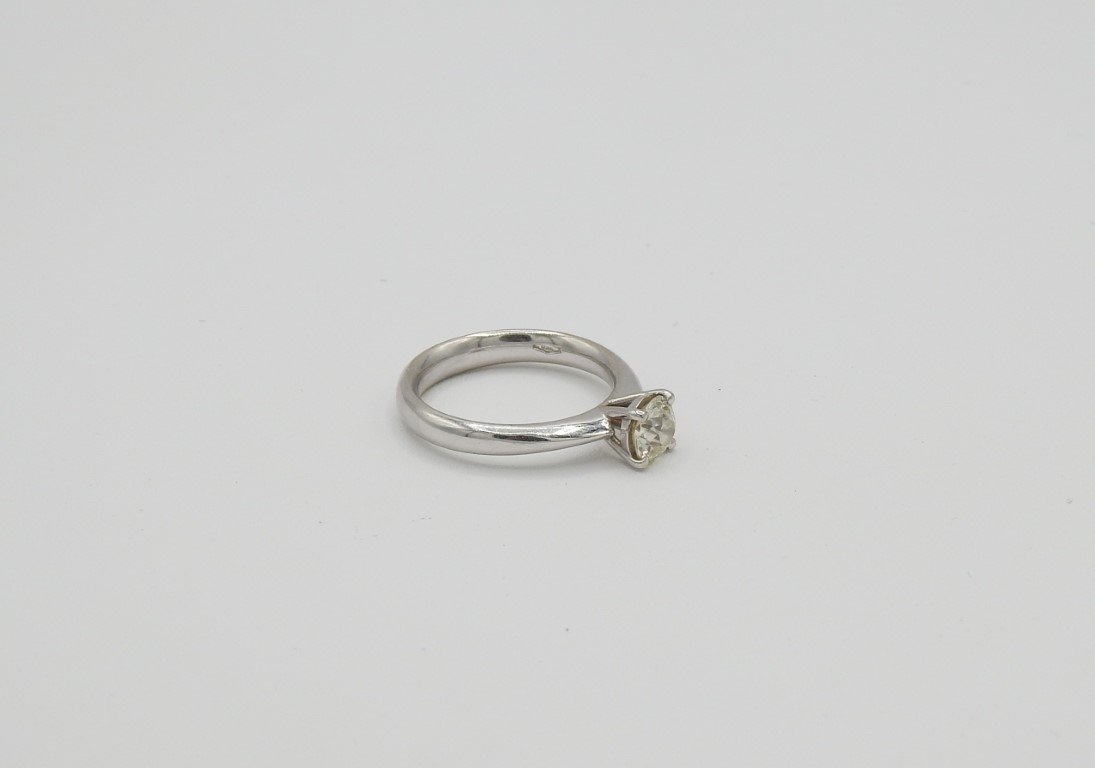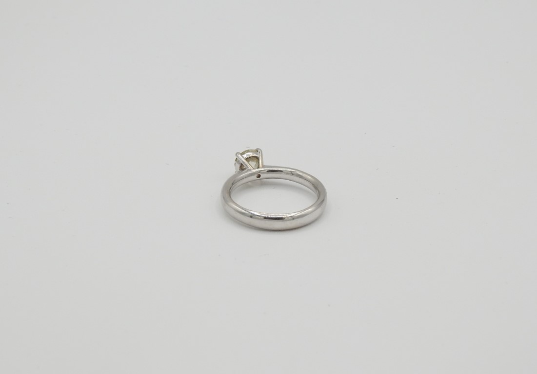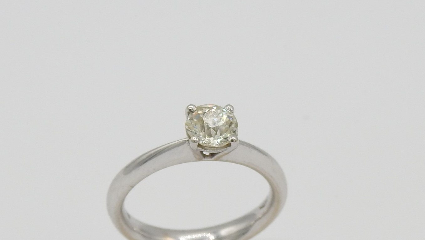 Anello solitario in oro bianco e diamante ct 0,75 stimati, colore K, purezza SL1, taglio antico, con scheggiature sulla corona