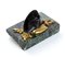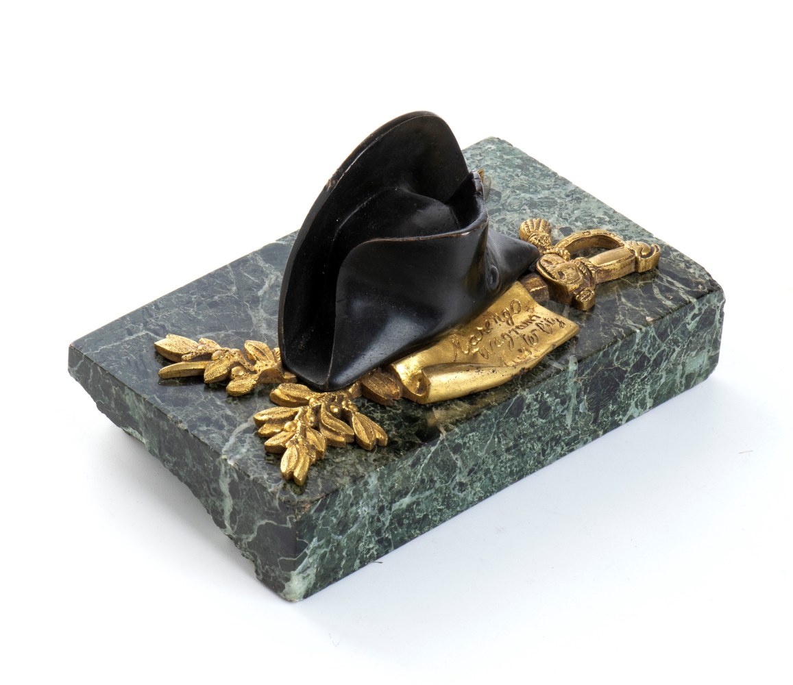 fermacarte di trofeo d'arme e capello di Napoleone, base marmo verde