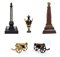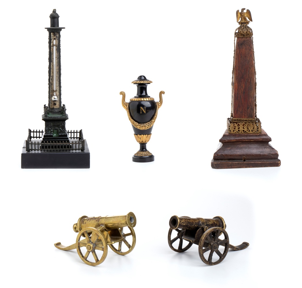 Lotto composto da 1 colonna di Place Vendome in bronzo e base di marmo h 19 cm; Obelisco in legno e bronzo con Aquila imperiale h 21 cm; Urna napoleonica in marmo nero e bronzo h 13 cm, Coppia di cannoni in miniatura in bronzo 5x12.