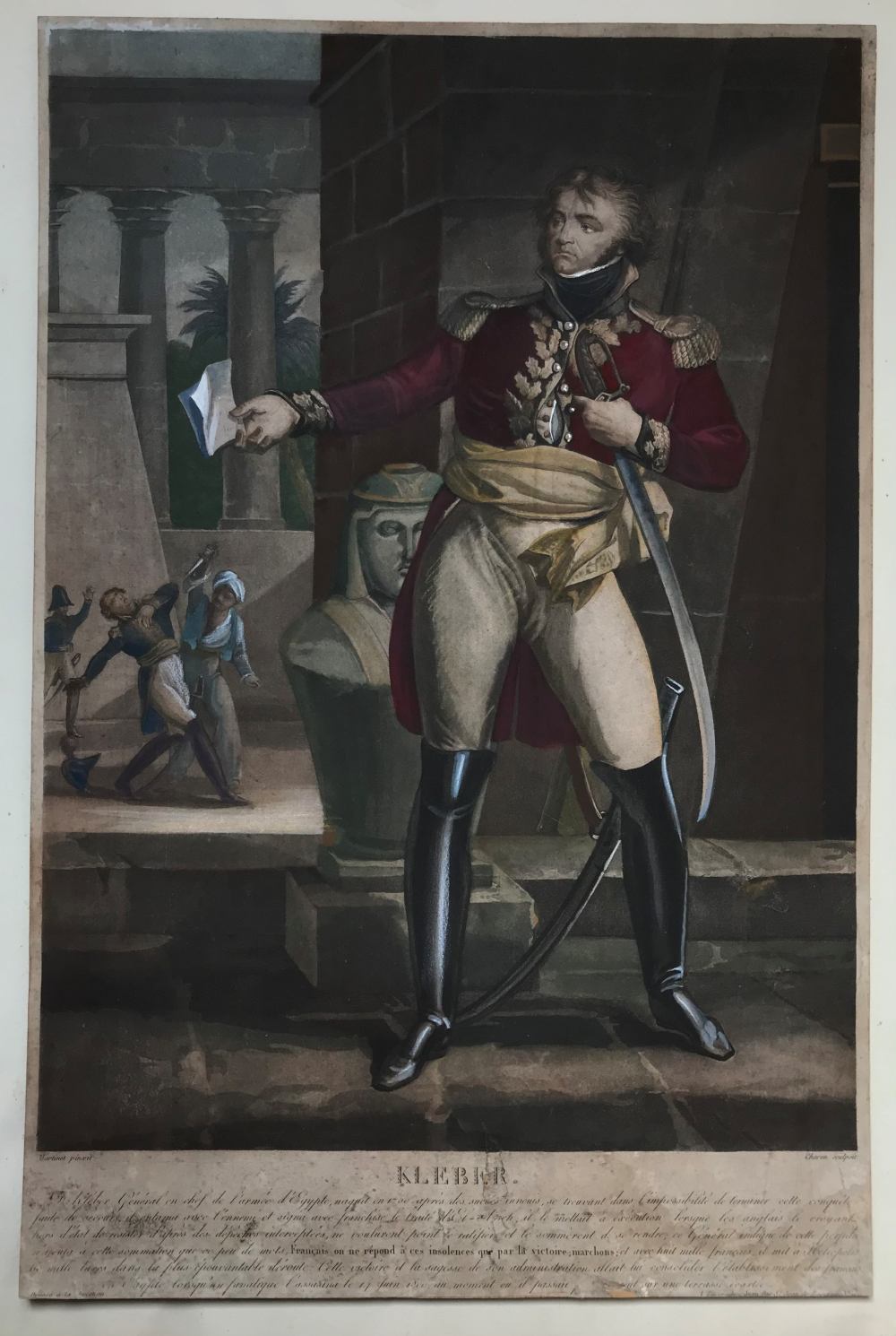- Eccellente e rarissima incisione all'acquatinta colorata a mano dal ritratto originale del generale Kleber di Pierre Martinet inciso da Louis-François Charon. Si tratta di una delle loro numerose collaborazioni per immagini militari. Kleber rimane un eroe nazionale celebrato con ritratti e statue in tutta la Francia. Questa immagine lo ritrae eroicamente in piedi con i suoi abiti militari in un palazzo egiziano, mentre il suo assassinio nell'anno 1800 è raffigurato sulla sinistra. Questo foglio è inedito sul mercato, la colorazione a mano è dell'epoca e della migliore qualità artistica e tecnica. La stampa proviene da un'antica famiglia romana legata al regno di Napoleone.