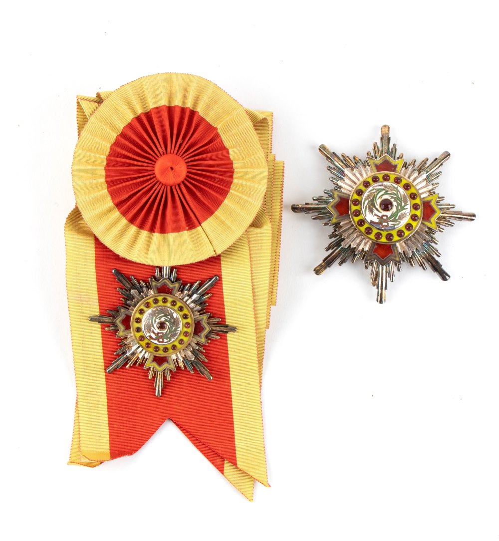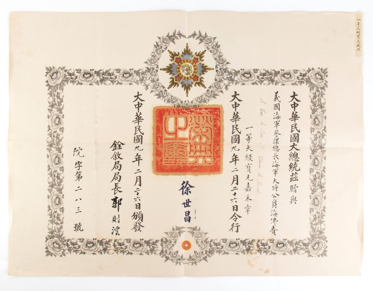 Ordine del prezioso grano d'oro brillante, prima classe, con custodia, placca e fascia con pendente, argento dorato e smalti, al verso, in caratteri cinesi marchio del fabbricante, 'Realizzato dall'Ufficio di incisione e stampa,con diploma di concessione al Grande Ammiraglio Thaon de Revel, molto raro