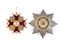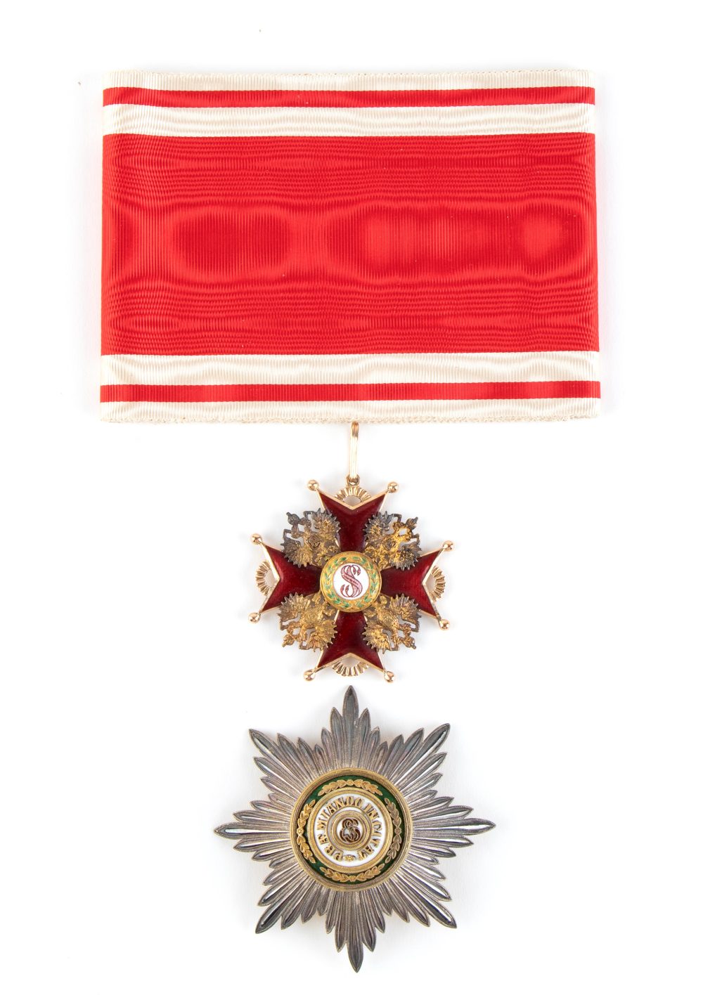 Set di 1a classe, divisione civile per cristiani, manifattura russa, 1910-1917 circa, Edouard di San Pietroburgo. Placca in argento con applicazioni in oro e smalti, doreata al verso con marchi del fabbricante, pendente in oro (14 carati) unifaccia cesellato e smaltato a quattro raggi doppi con punte pomellate accantonate di aquila bicipite,smalti rossi , medaglione centrale bianco con due S maiuscole . Anello di sospensione scanalato. Sul retro, raggi dorati bombati, centro in smalto bianco con due punzoni del titolo S. in smalto rosa , punzone dell'argentiere Vera Dietwald (1910-1917) per Maison Edouard. Con fascia incompleta e diploma di concessione al Grande Ammiraglio Thaon de Revel.