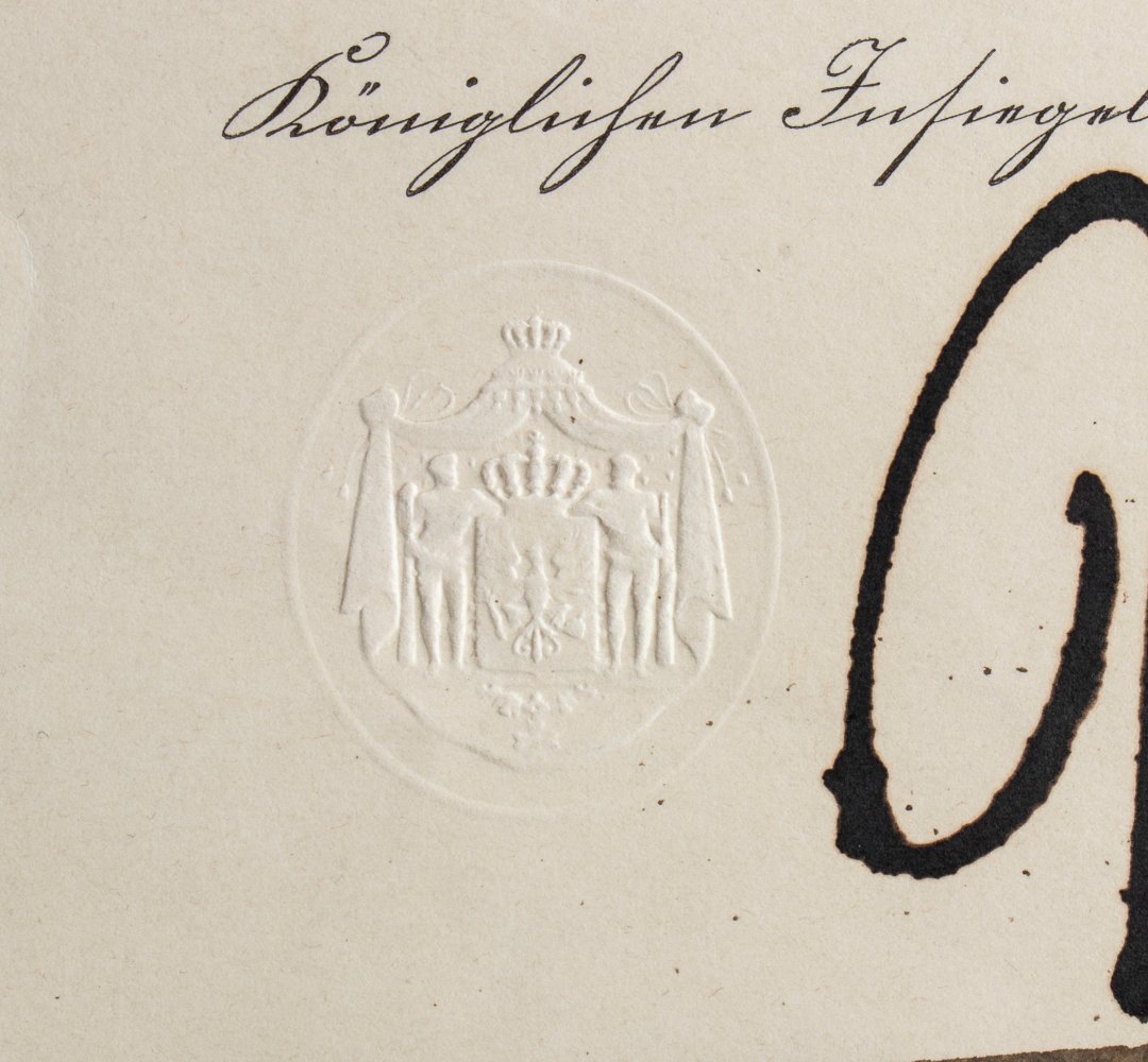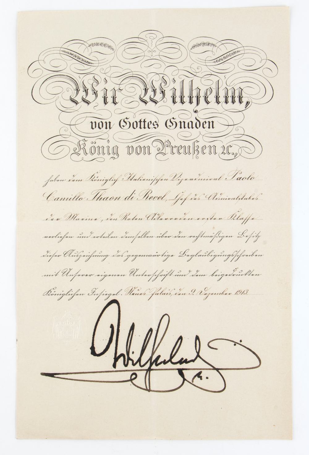 Set di gran Croce composto da placca in argento con centrale in smalti, pendente in oro e smalti marcato "N", Neuhaus & son Berlin al braccio inferiore, fascia di seta e diploma di concessione firmato per esteso dall'Imperatore Guglielmo, in ottimo stato.
