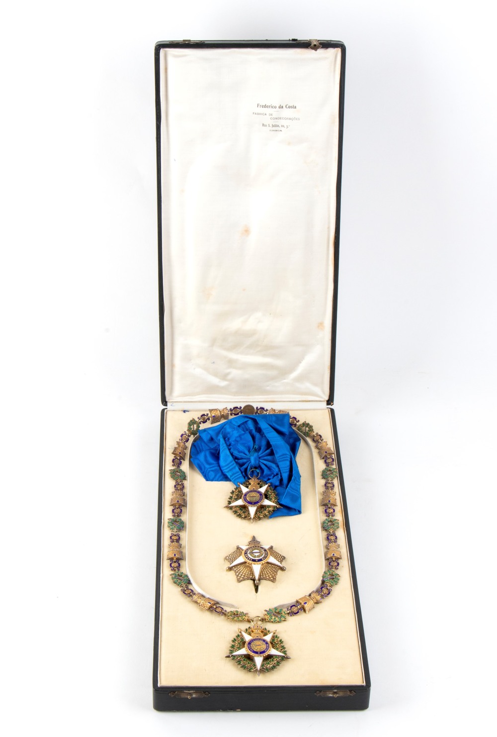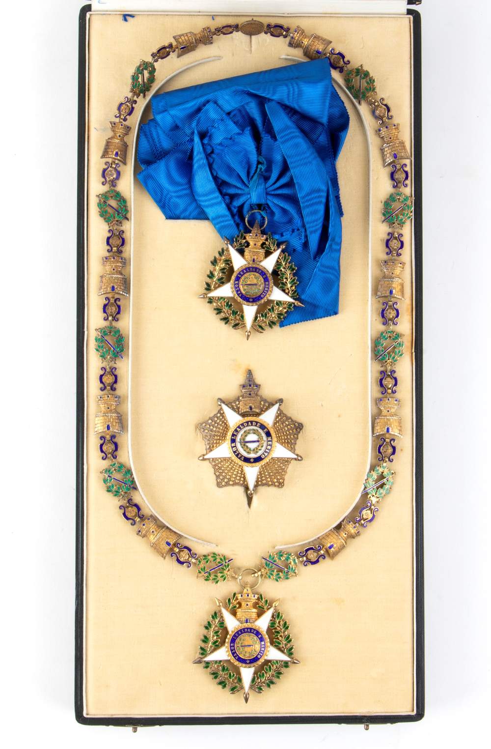 Portogallo - Ordine della Torre e della Spada, insieme di gran croce comprendente: la collana in vermeil composta da quarantuno maglie, dieci torri e dieci corone di quercia smaltata verde caricate con una spada smaltata blu, collegate da venti elementi decorativi maglie a forma di volute e fiori, in alto una piccola maglia circolare caricata con un gancio di sospensione, recante il motto dell'ordine, sotto il pendente dell'ordine in vermeil smaltato con centro in oro cesellato e smaltato; piatto in vermeil perlato, la stella smaltata, il centro in oro cesellato in tre parti smaltate, in astuccio con nome del gioielliere Federico da Costa, Lisbona.