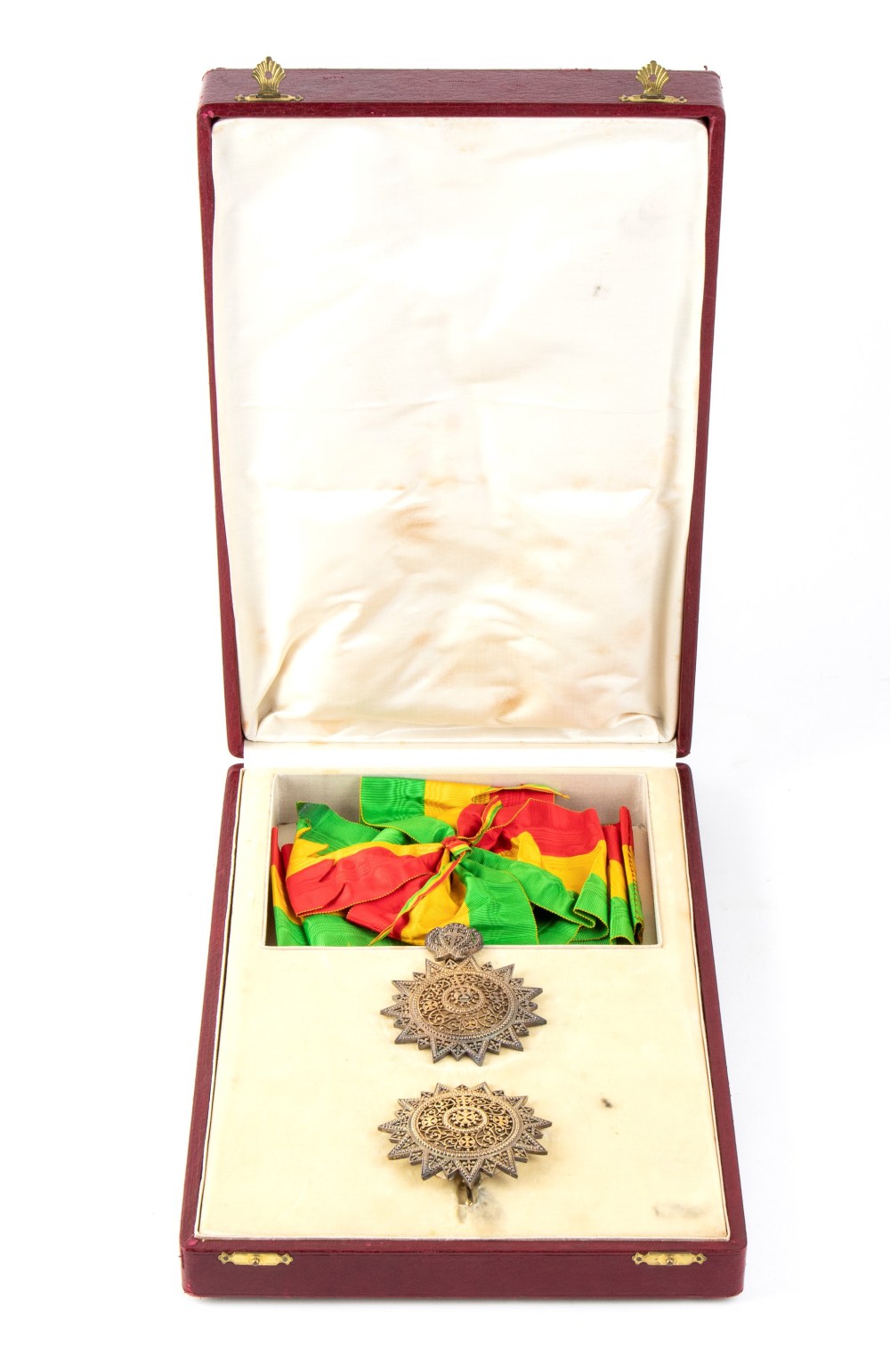 Placca e pendente con fascia in argento filigranato, cesellato e dorato, fascia in seta con i colori nazionali, conservato in astuccio di marocchino rosso con impresso il Leone di Giuda,in ottimo stato