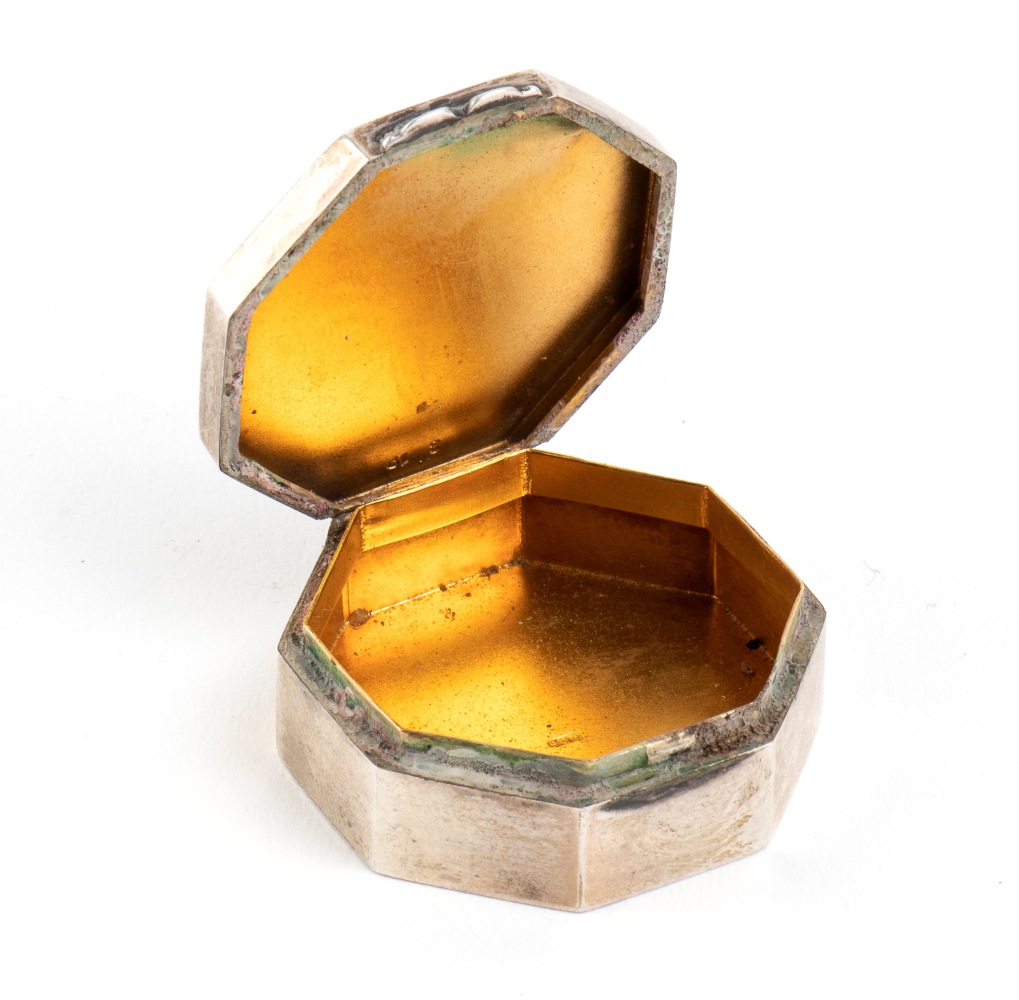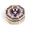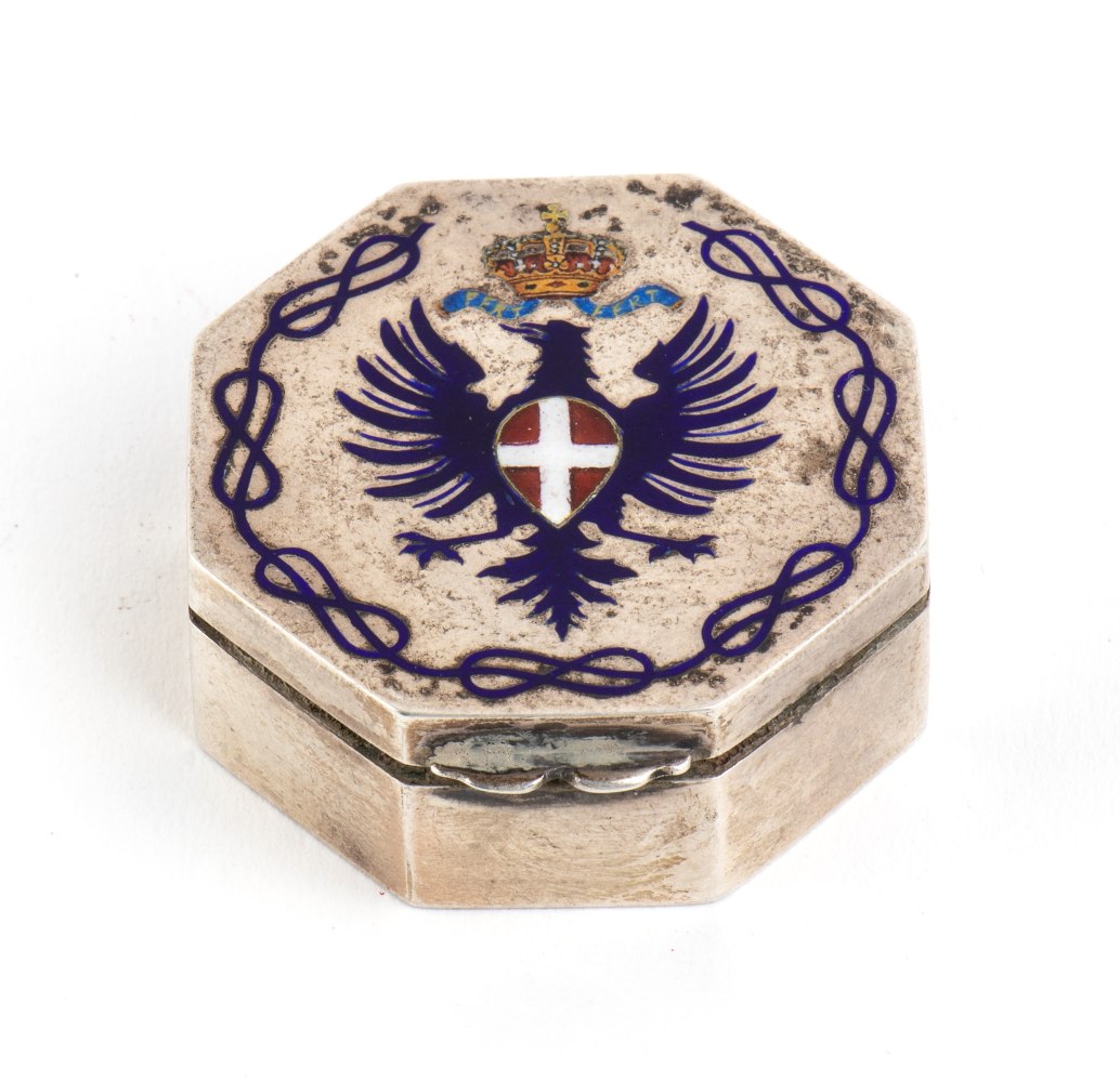 Bellissima scatola portapillole di forma ottagonale con aquila sabauda miniata in smalti policromi su argento, appartenuta a Sua Maestà Umberto I, marcata ed in ottimo stato di conservazione
