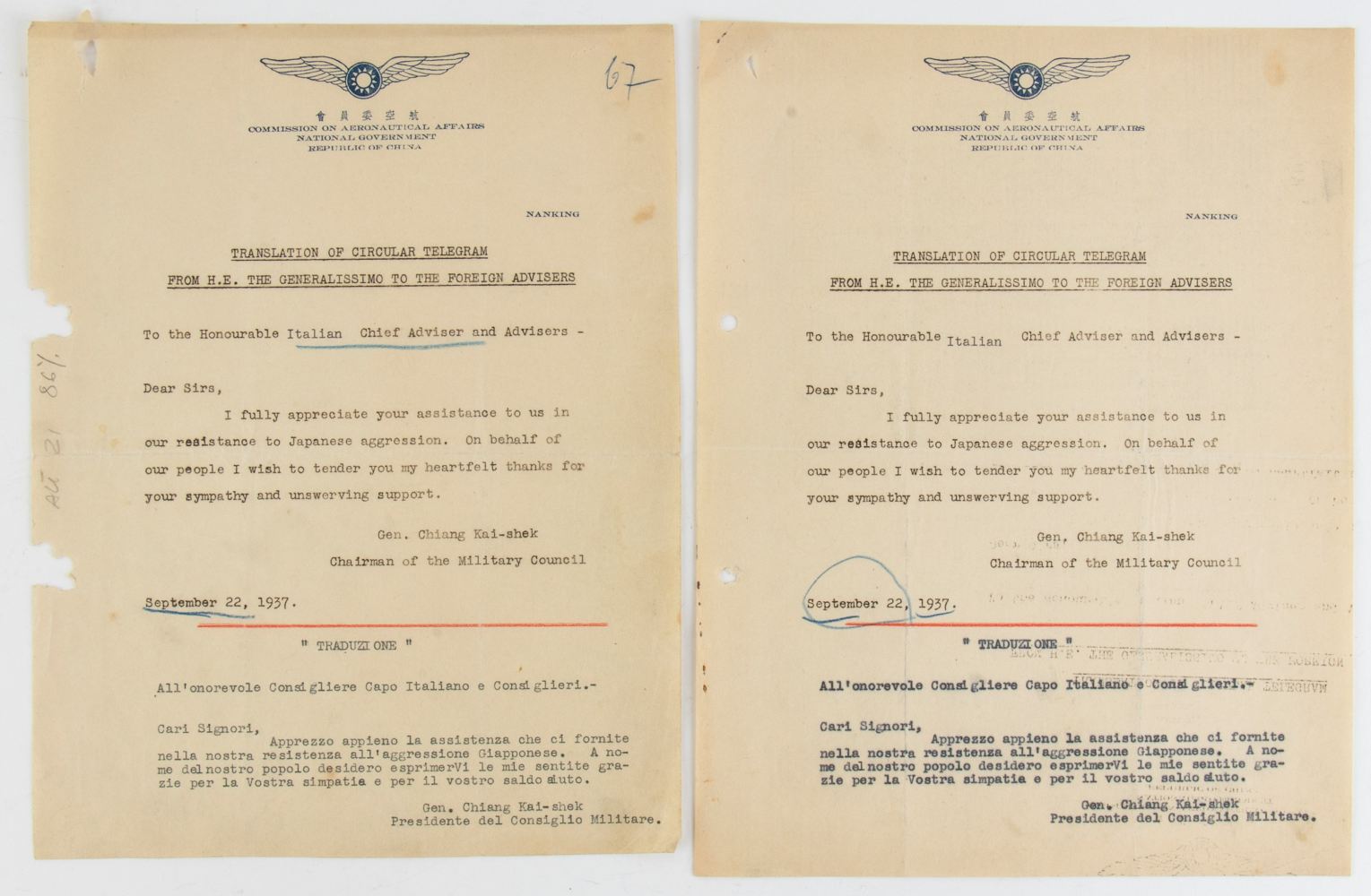 Traduzioni ufficiali su carta intestata inviati da Chiang Kai-shek al consigliere militare capo, generale Silvio Scaroni .il 22 settembre 1937, molto interessante il contenuto in cui il generalissimo ringrazia ufficialmente l'addetto militare italiano per il supporto ricevuto nella guerra Sino-Giapponese, da notare che all'epoca l'Italia ancora non era ufficialmente alleata del Giappone, rarissima, interessante