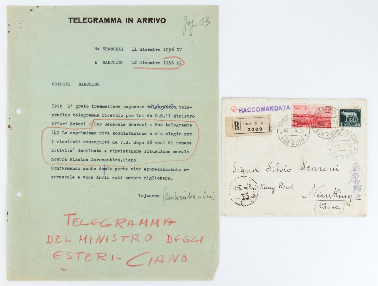 Telegramma in busta affrancata del ministro degli esteri Galeazzo Ciano al generale Silvio Scaroni Addetto militare presso il governo della repubblica nazionalista di Cina, molto interessante anche da punto di vista filatelico.