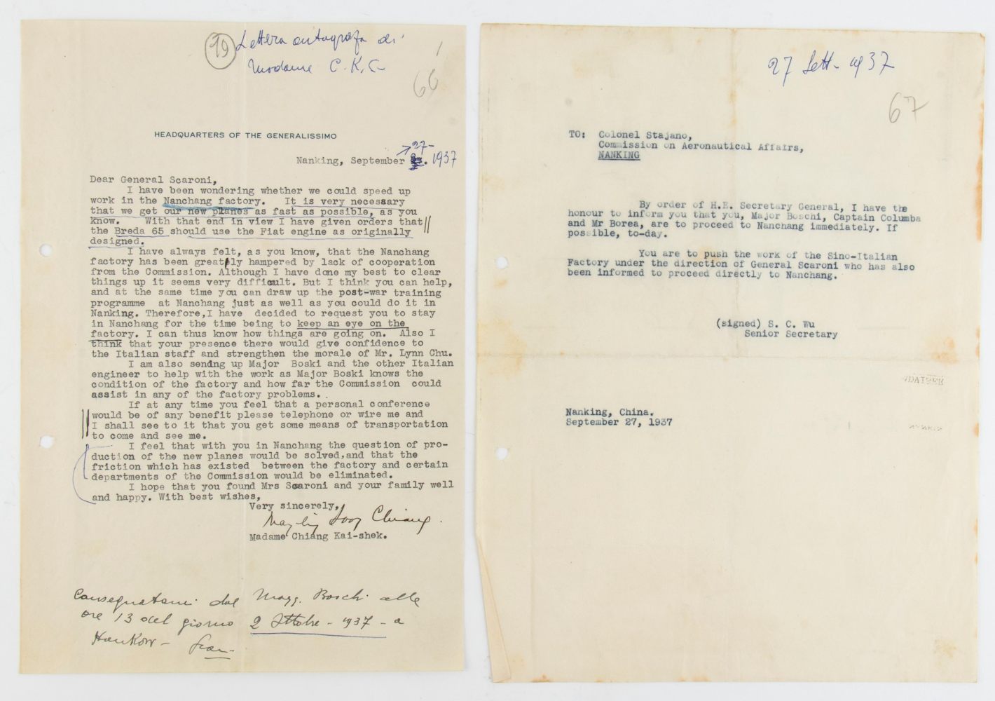 Lettera dattiloscritta indirizzata al generale Scaroni, consigliere capo per l'aviazione presso il governo della repubblica Cinese di Chiang Kai-Shek controfirmata da Madame Chiang Kai-shek, in buono stato, Rara