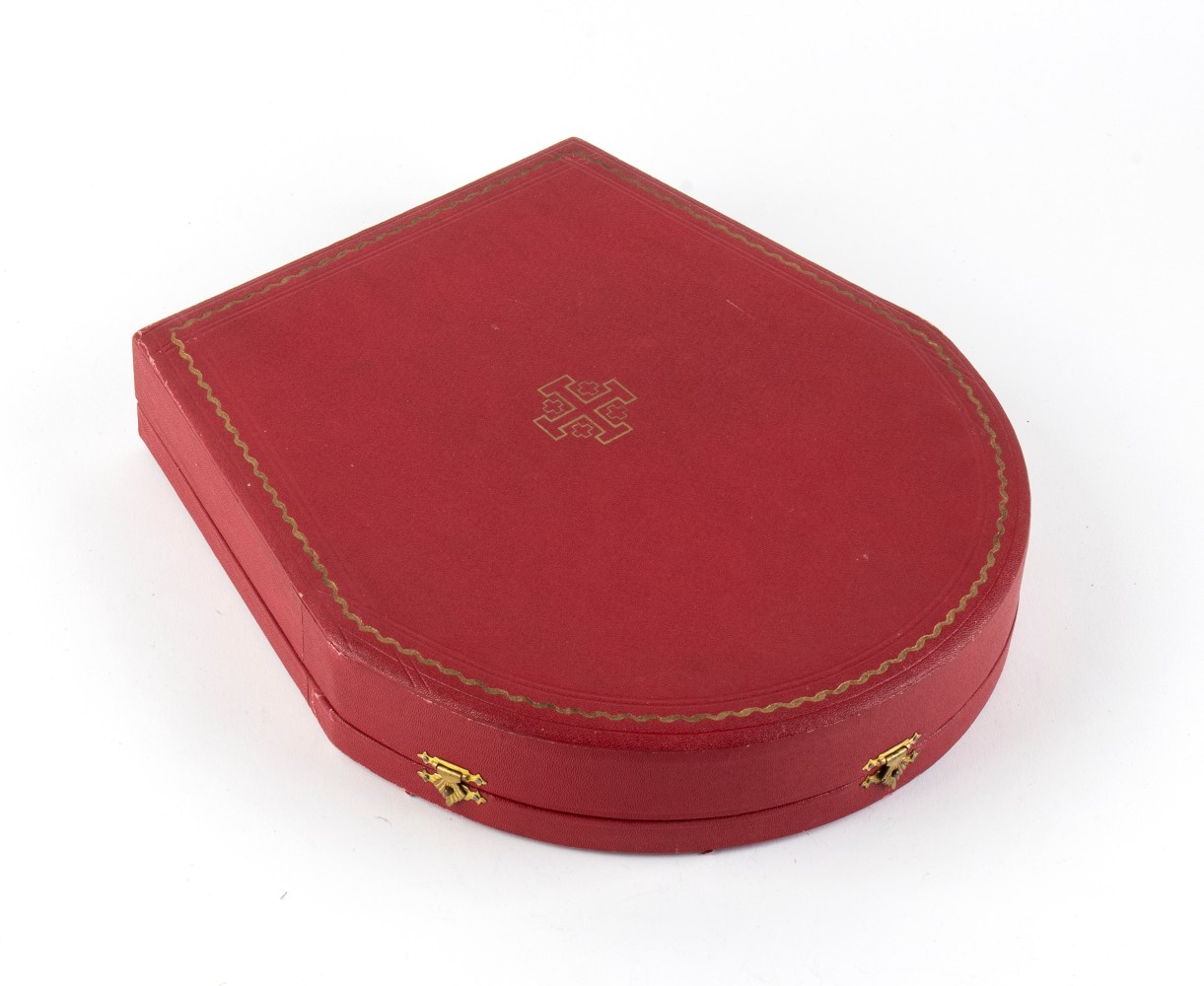 Bellissima insegna da dama dell'ordine in argento e smalti, placca in argento con applicata croce di Gerusalemme in smalti rossi e serto di foglie di alloro,, fascia di seta nera marezzata con applicato pendente con fiocco in argento dorato e smalto rosso , in ottimo stato, conservata in particolare astuccio di pelle foderato di seta con impressioni in oro