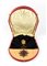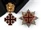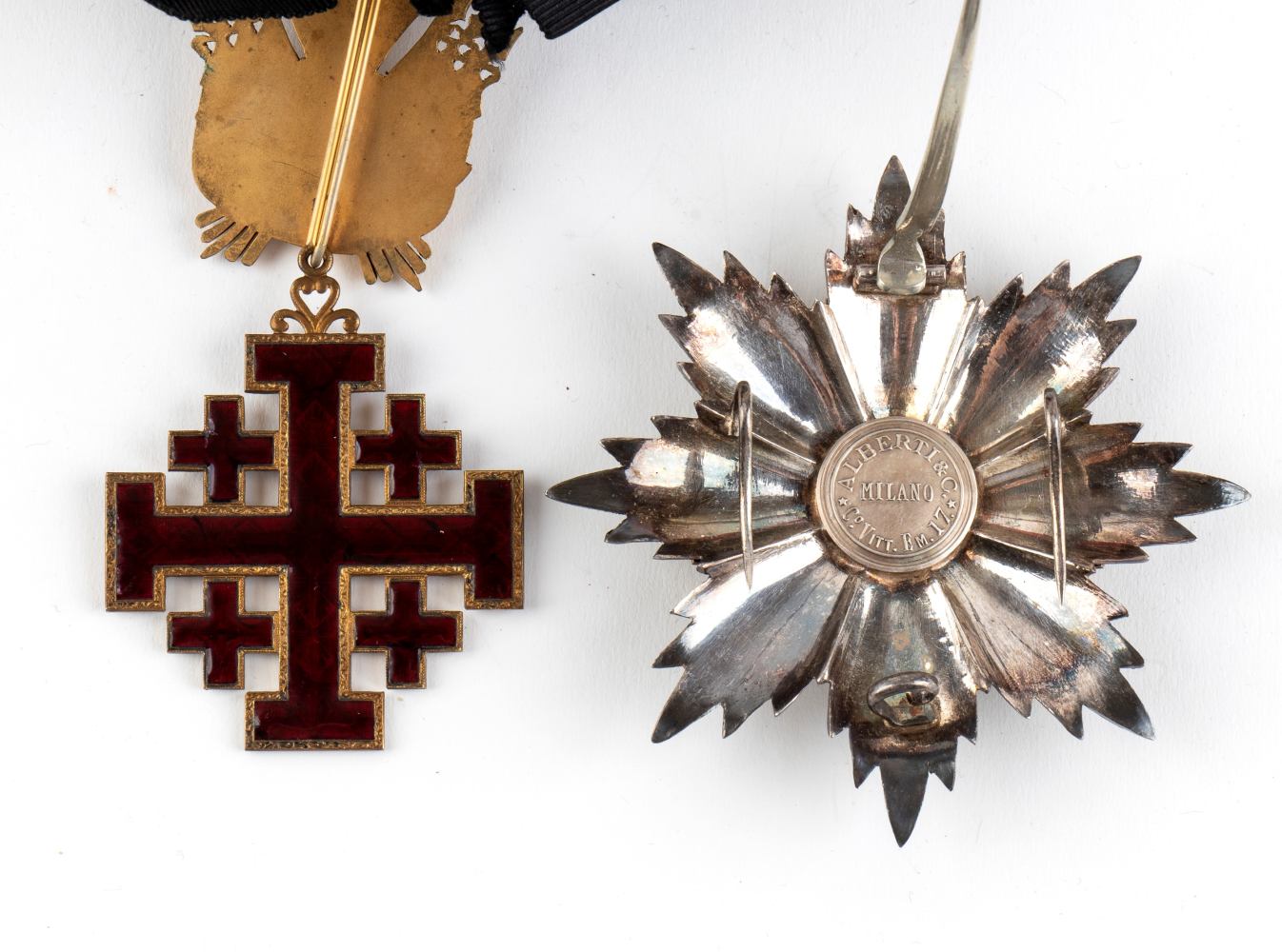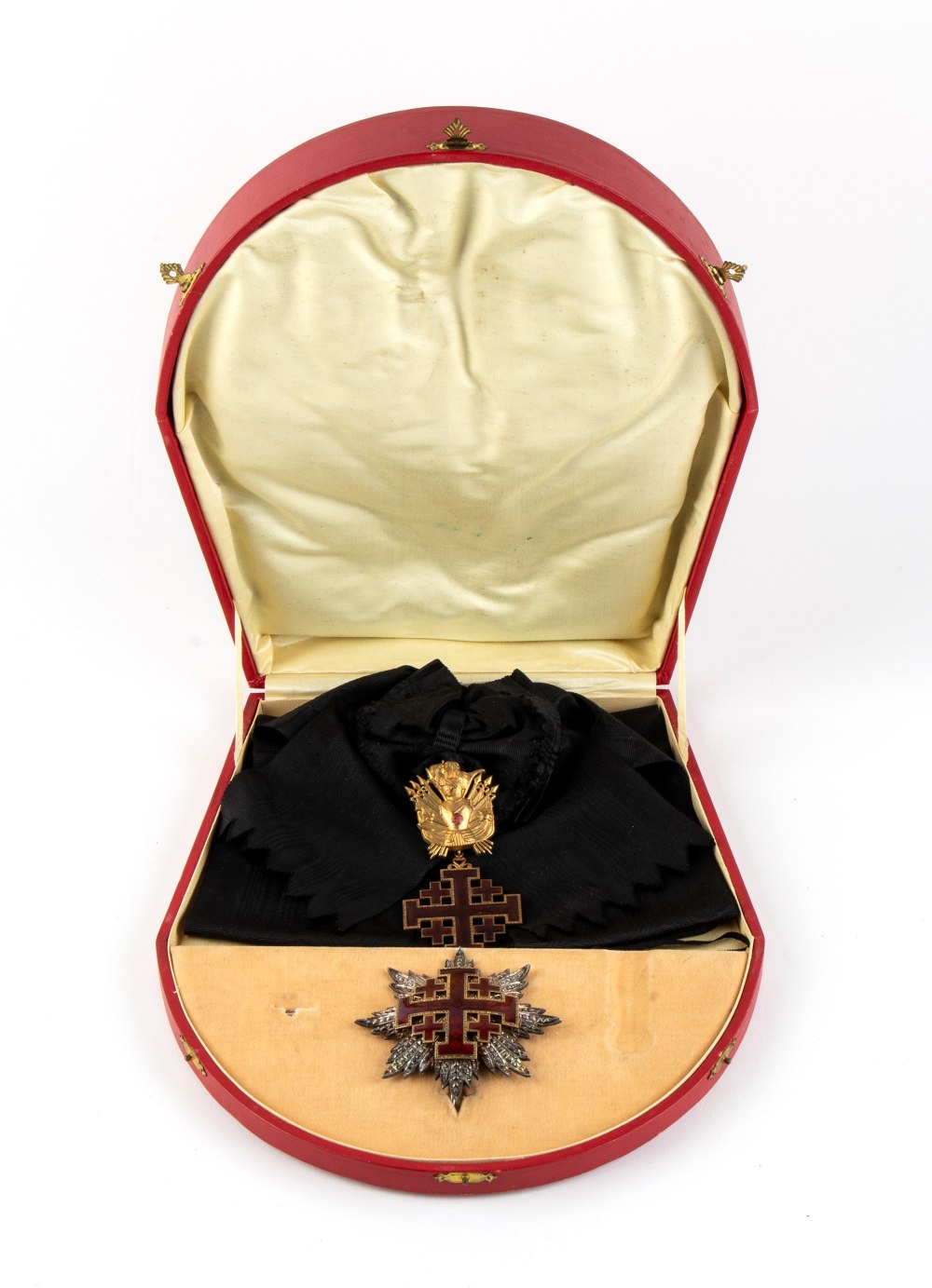 Bellissima insegna dell'ordine in argento e smalti, placca in argento con applicata croce di Gerusalemme in smalti rossi, fascia di seta nera marezzata con applicato pendente con trofeo d'armi in argento e smalto rosso , in ottimo stato, conservata in particolare astuccio di pelle foderato di seta con impressioni in oro ,mancante di Rosetta e miniatura