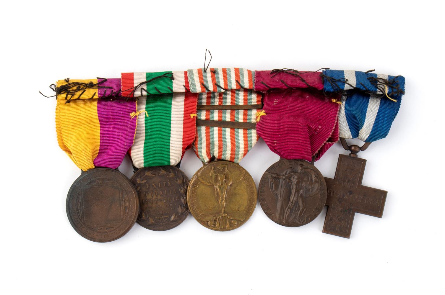 Medagliere composto da una croce di guerra, volontario I GM, medaglia della Grande Guerra con due barrette, Unità d'Italia e Marcia su Roma, in buono stato, montato in origine,
