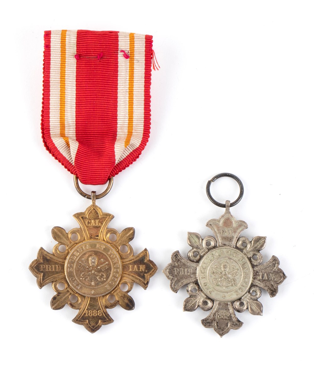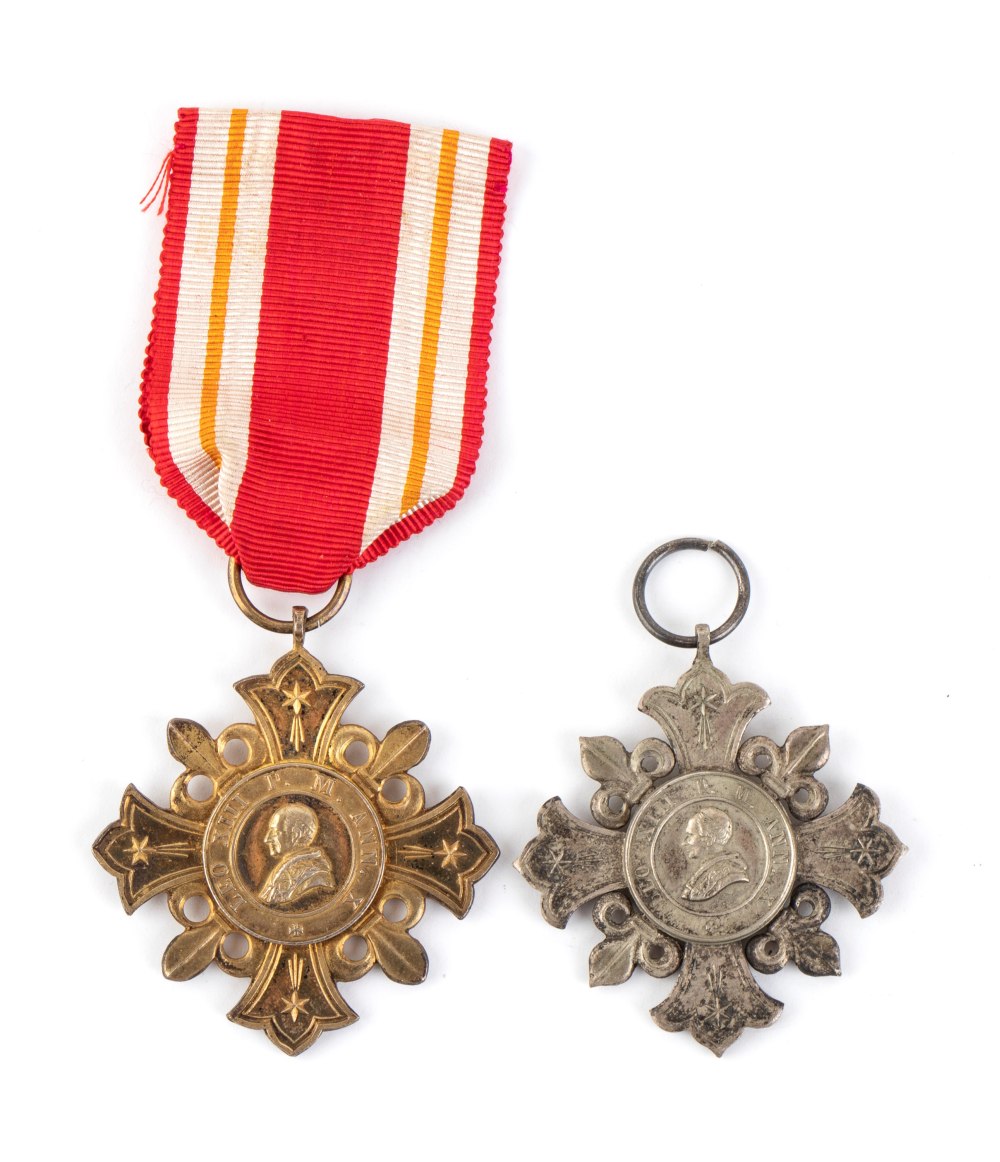 Lotto composto da due medaglia di benemerenza Leone XIII in argento e metallo dorato. Una delle due priva di nastro