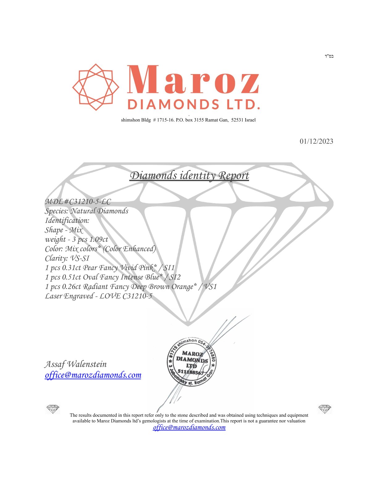 3 DIAMANTE COLORE ESALTATO 1,09 CARATI COLORE MIX* - PUREZZA VS-SI - TAGLIO MIX - INCISO AL LASER - CERTIFICATO GEMMOLOGICO MAROZ DIAMONDS LTD MEMBRO ISRAEL DIAMOND EXCHANGE - C31210-5-LC
