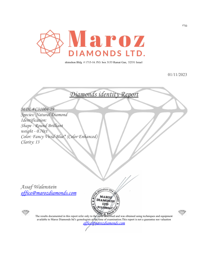 Lotto 130 | DIAMANTE 0,7 CT FANCY VIVID BLU - I3 - C31004-19