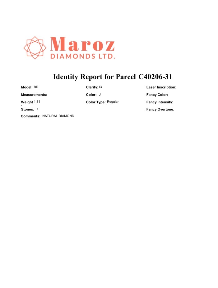 DIAMANTE 1,81 CT J - PUREZZA I3 - TAGLIO BRILLANTE - CERTIFICATO GEMMOLOGICO MAROZ DIAMONDS LTD MEMBRO ISRAEL DIAMOND EXCHANGE - C40206-31