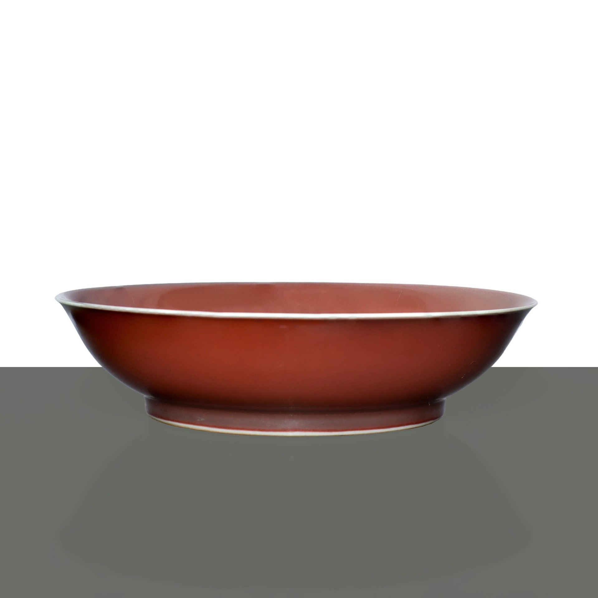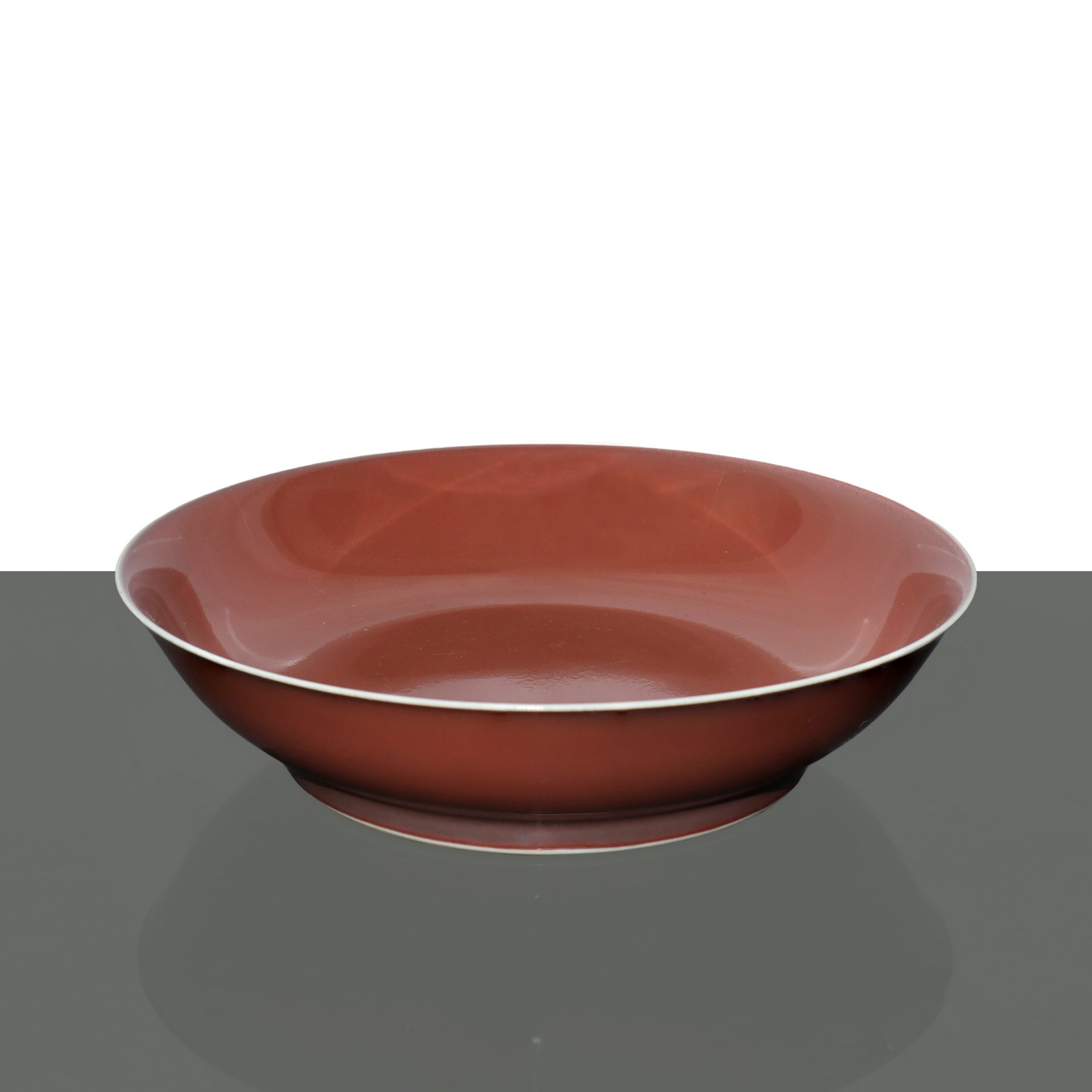 Piatto in ceramica cinese smaltato rosso, appartenente alla dinastia Qing, Nineteen° secolo H cm 6 x 21 Presenta scritte cinesi alla base. Presenta scritte cinesi alla base.