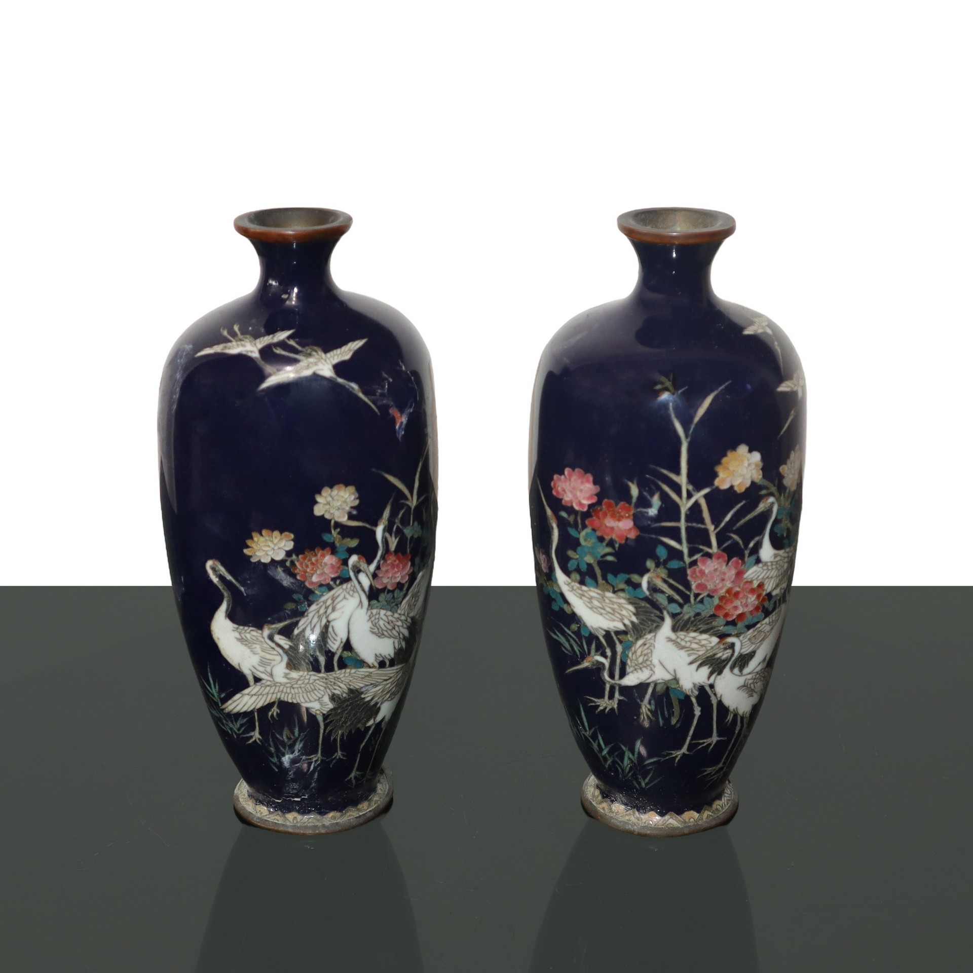 Coppia di vasi cloisonne blu con decori di aironi e fiori, Japan, Mejii period, fine 19° secolo