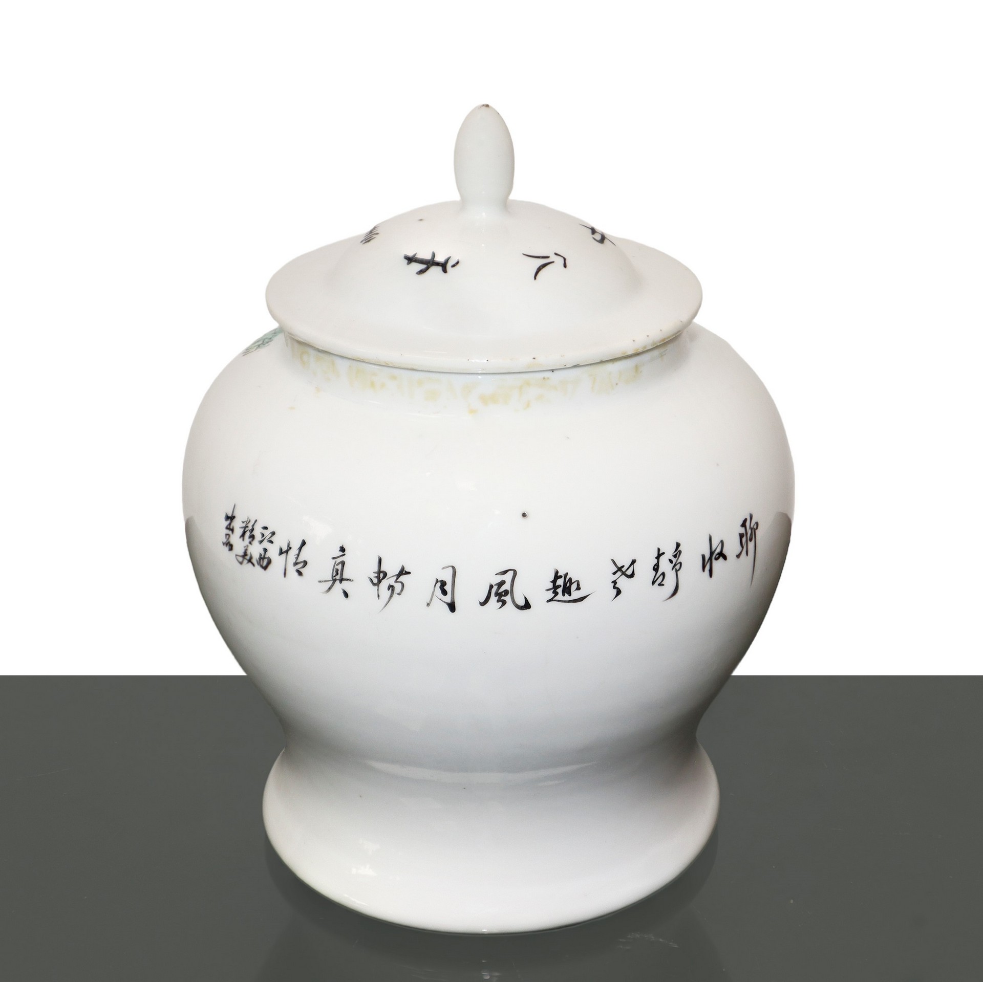Potiche cinese in porcellana bianca con scena familiare H cm 20x 14.5 Potiche di ceramica bianca con raffigurazione di uomo e donna con abiti e acconciature orientali e iscrizioni con caratteri cinesi. Coperchio con iscrizioni cinesi e pomello conico arrotondato. Timbro caratteri cinesi alla base.Potiche di ceramica bianca con raffigurazione di uomo e donna con abiti e acconciature orientali e iscrizioni con caratteri cinesi. Coperchio con iscrizioni cinesi e pomello conico arrotondato. Timbro caratteri cinesi alla base.