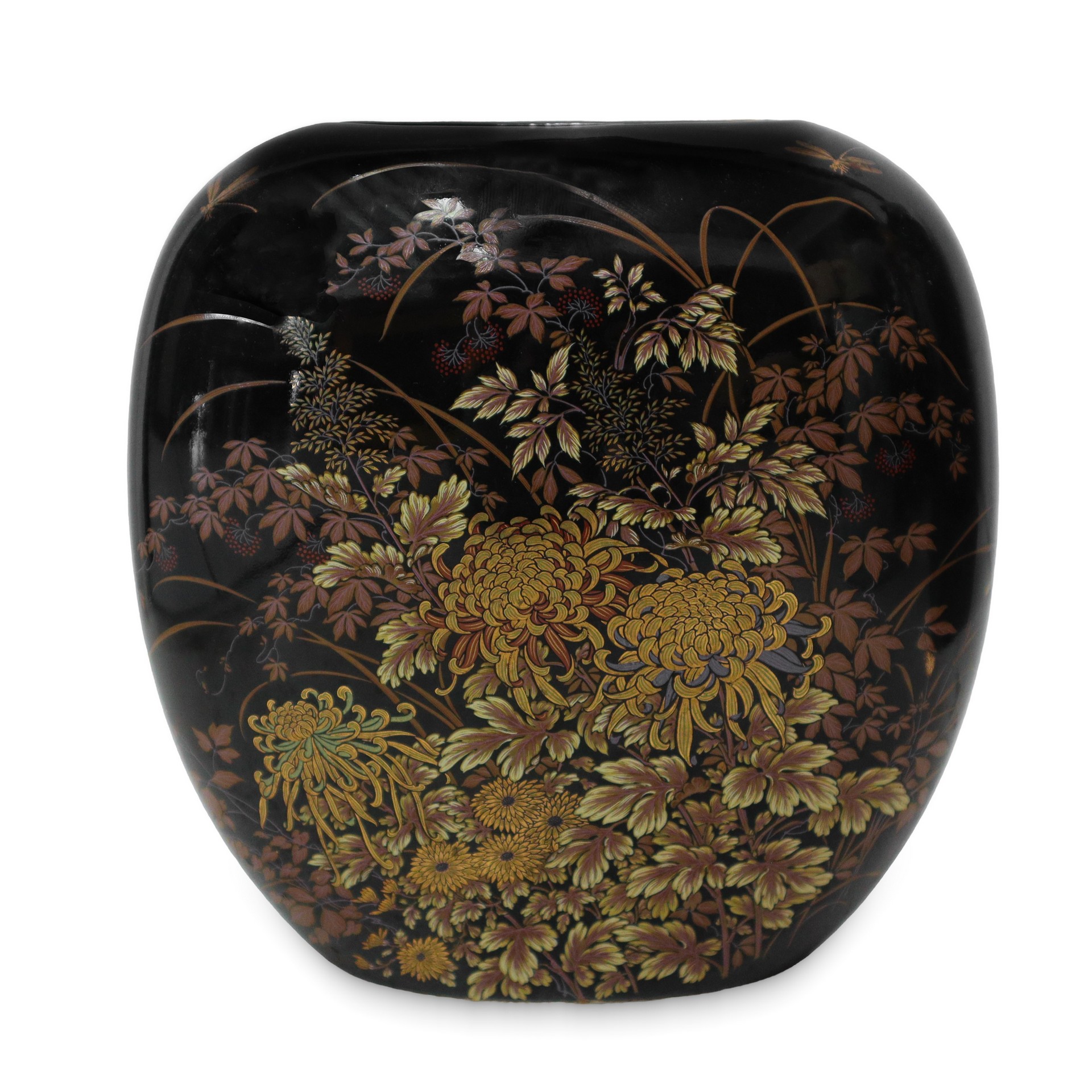 Shibata Japan - Vaso in porcellana, base nera con decorazioni floreali dorate