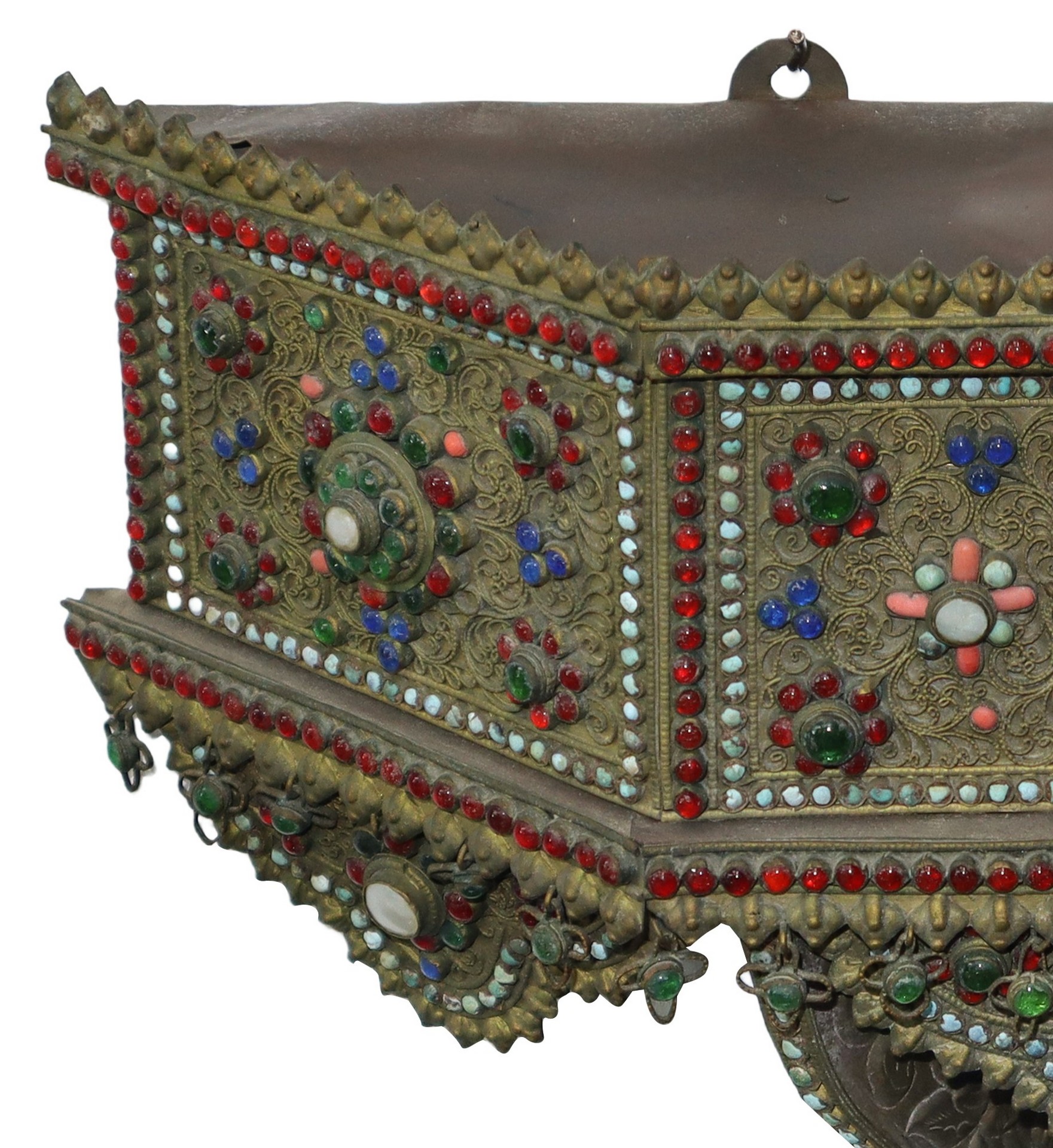 Mensola orientale con pietre dure, lapislazzuli e madreperla H cm 25x8.5 Mensola in rame con decorazione in pietre dure, lapislazzuli e madreperla. Decorazioni floreali e antropomorfe realizzate con le pietre e decorazioni floreali sbalzate sulla parte inferiore. Iscrizione in caratteri orientali sul retro. Sul retro, dicitura “Nepal”. Mensola in rame con decorazione in pietre dure, lapislazzuli e madreperla. Decorazioni floreali e antropomorfe realizzate con le pietre e decorazioni floreali sbalzate sulla parte inferiore. Iscrizione in caratteri orientali sul retro. Sul retro, dicitura “Nepal”.