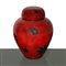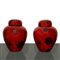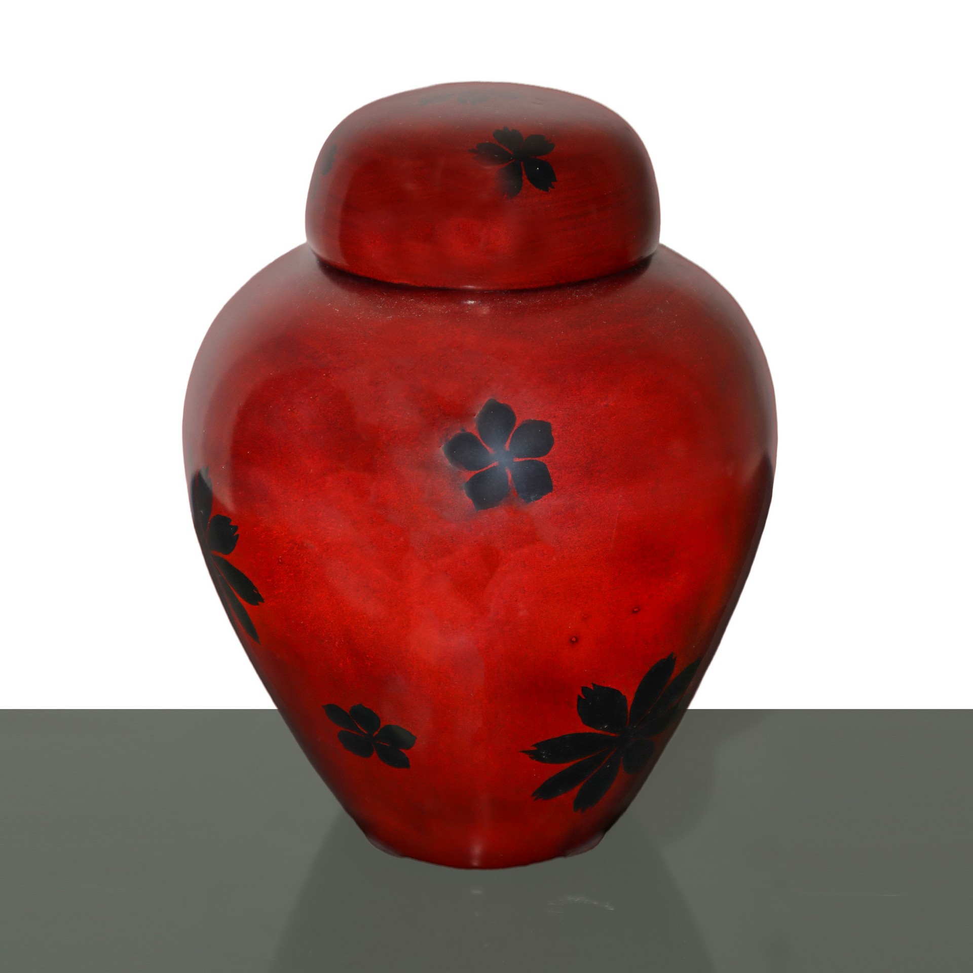 Coppia di vasi orientali con coperchio laccati in rosso e decorazioni floreali nere