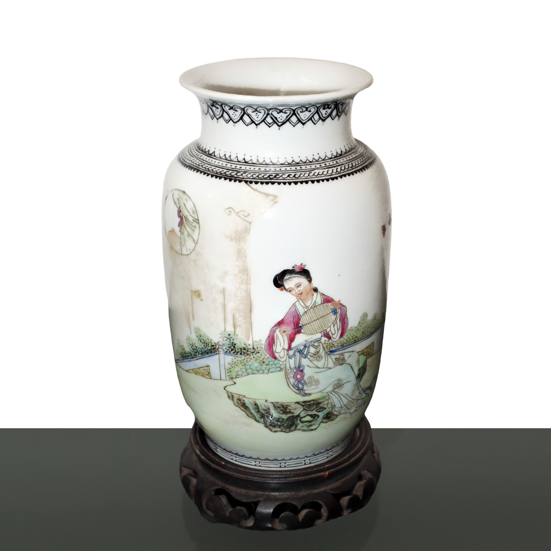 Vaso giapponese in porcellana bianca con raffigurazione di geisha H cm 15.8x8.5 - con base H cm 18.1x9 Vaso giapponese in porcellana bianca con decorazione policroma di geisha e iscrizioni con caratteri in giapponese. Timbro con caratteri giapponesi in rosso alla base. Base poggiavaso in legno, mancante di un pezzo.Vaso giapponese in porcellana bianca con decorazione policroma di geisha e iscrizioni con caratteri in giapponese. Timbro con caratteri giapponesi in rosso alla base. Base poggiavaso in legno, mancante di un pezzo.