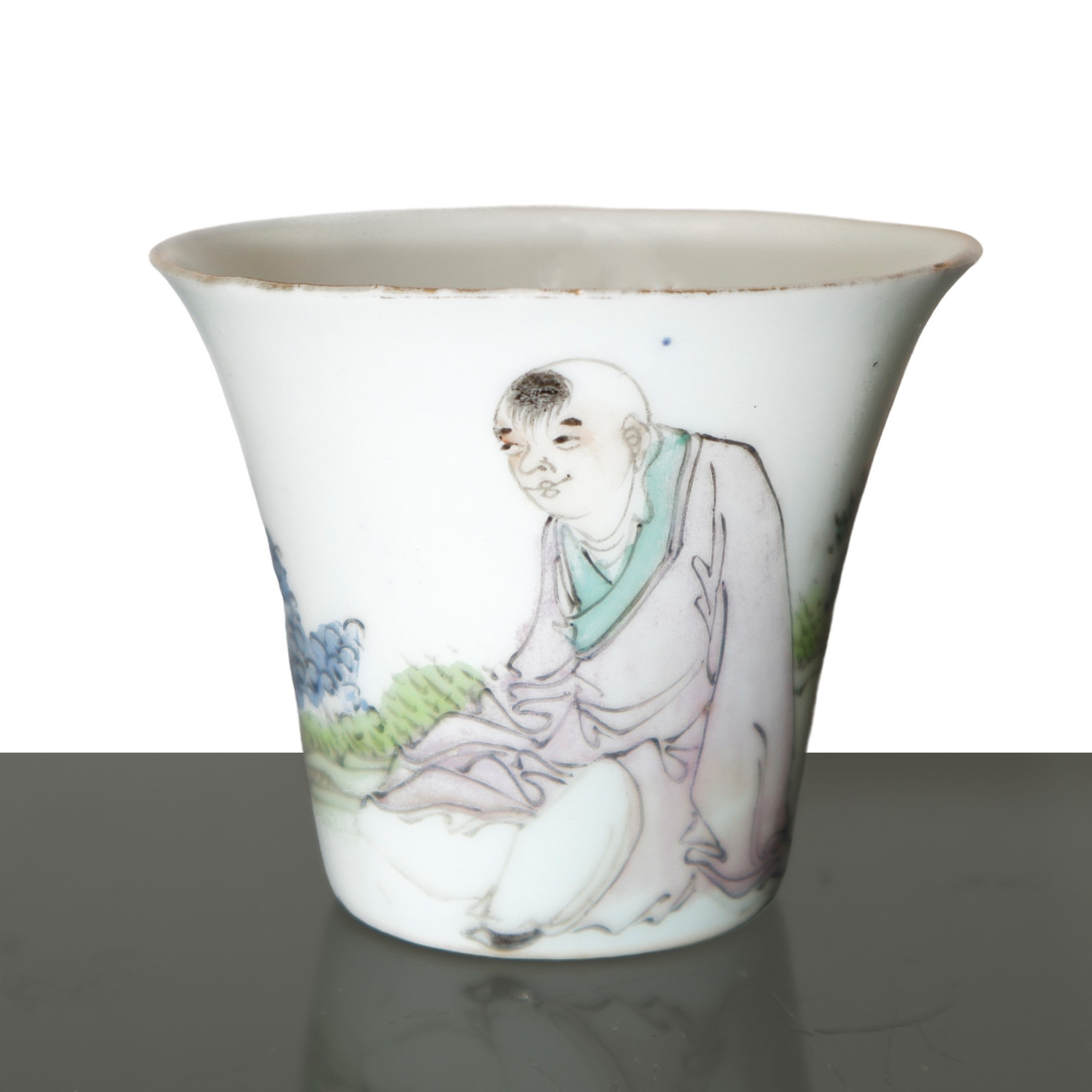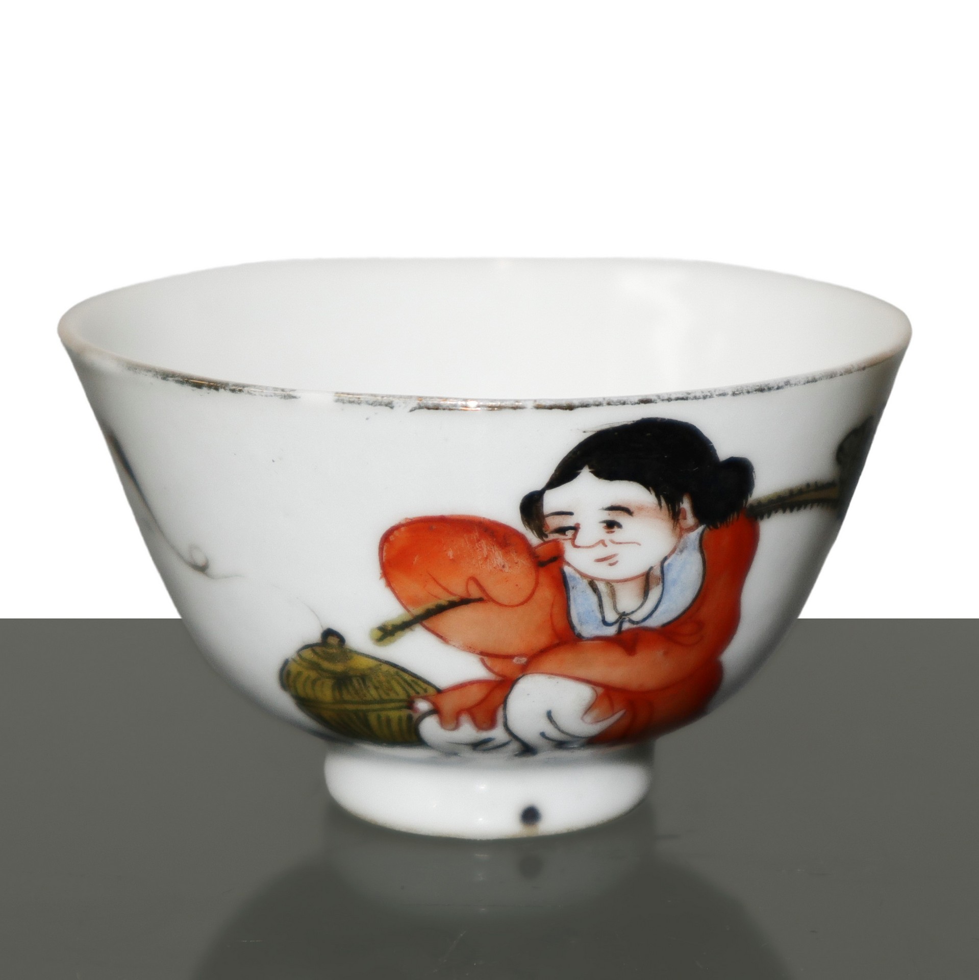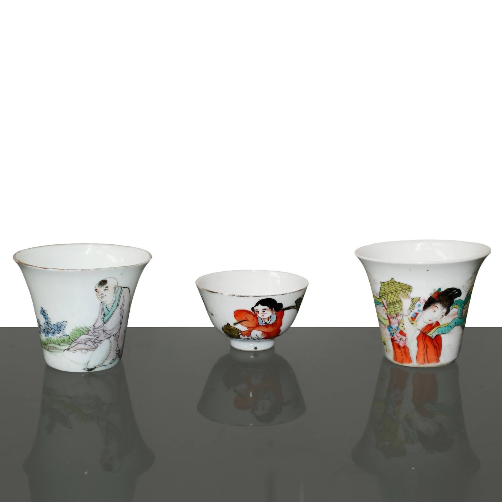 Coppia di vasetti e una ciotolina orientali in ceramica H cm 6x7.3 Due vasetti con raffigurazione di donna e uomo, una ciotolina con raffigurazione di donna. Due vasetti con raffigurazione di donna e uomo, una ciotolina con raffigurazione di donna.