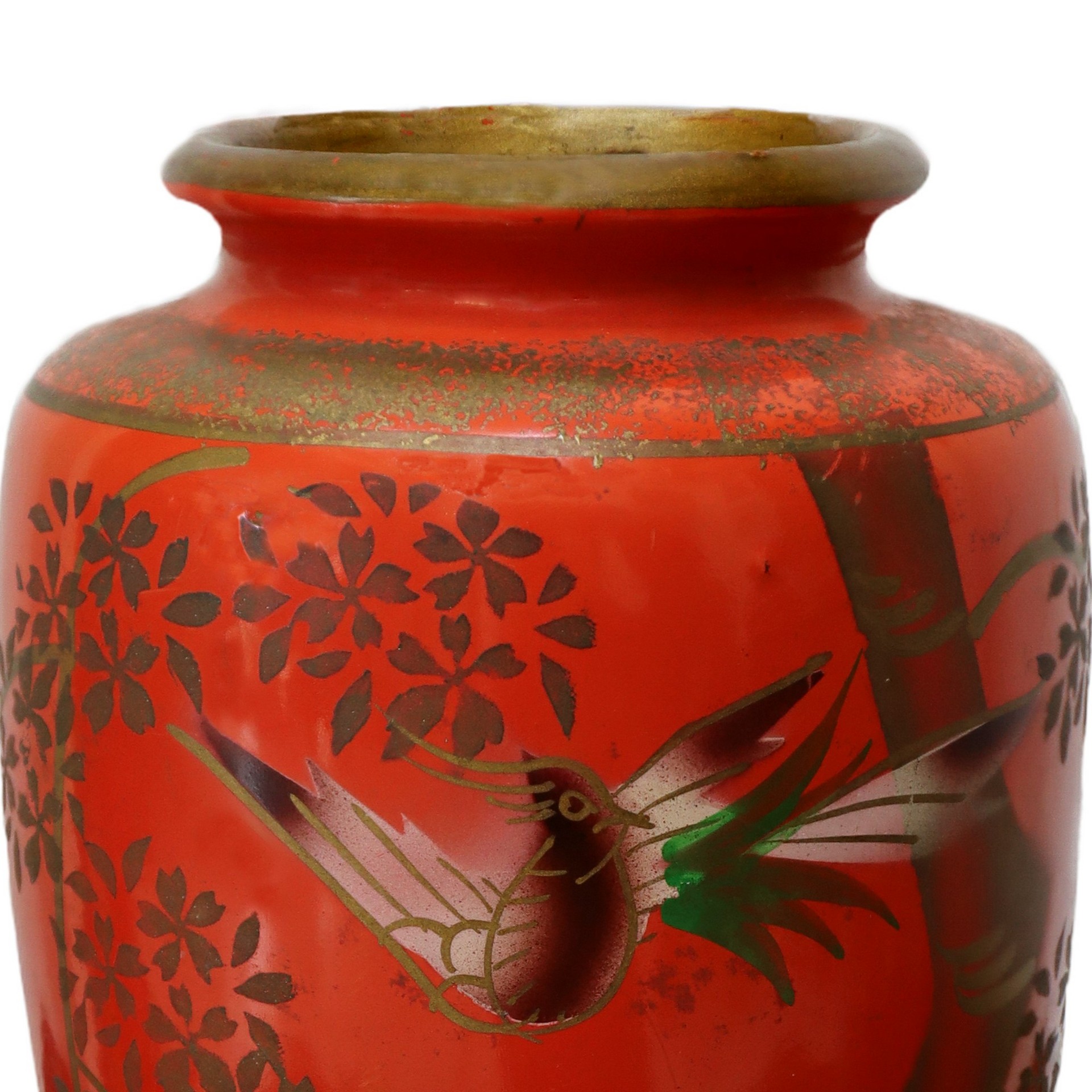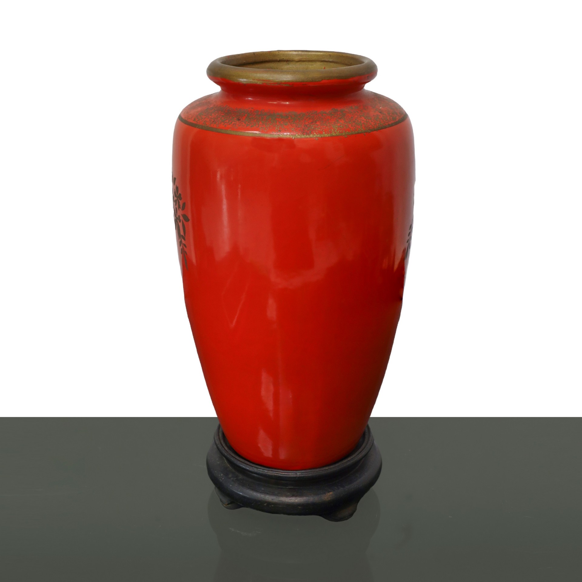 Lotto 238 | Vaso cinese in ceramica, laccato rosso con decorazioni di uccelli e bamboo