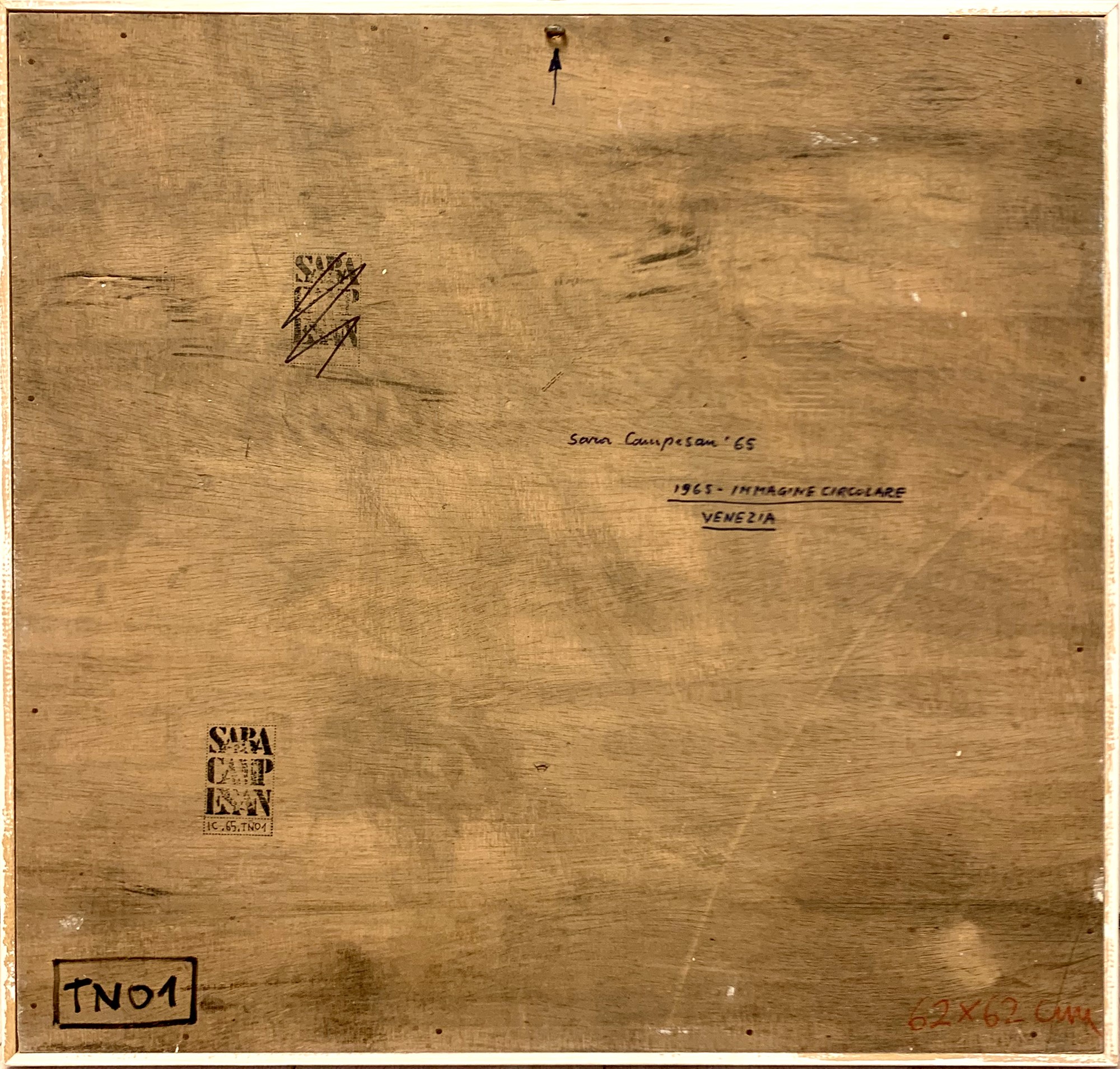 Firma, data, data, titolo, luogo "Sara Campesan, 65, 1965, Immagine circolare, Venezia";timbro dell'artista (al retro)