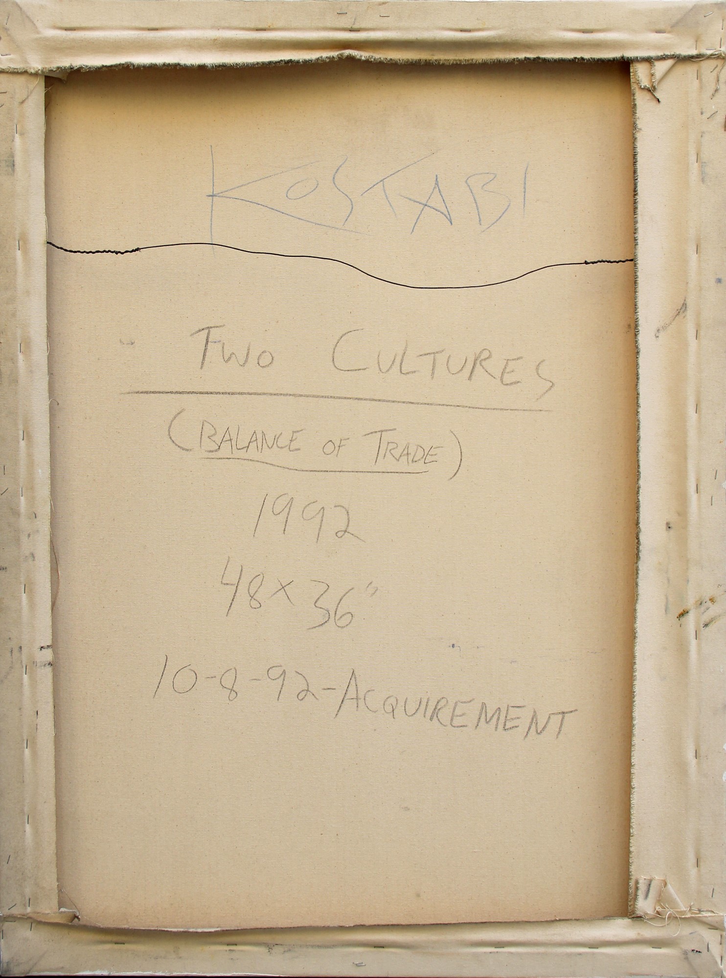 Firma, titolo, data, misura, numerazione "Kostabi, Two cultures (balance of trade), 1992, 48x36'', 10-8-92-acquirement" (al retro)